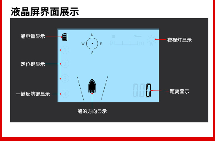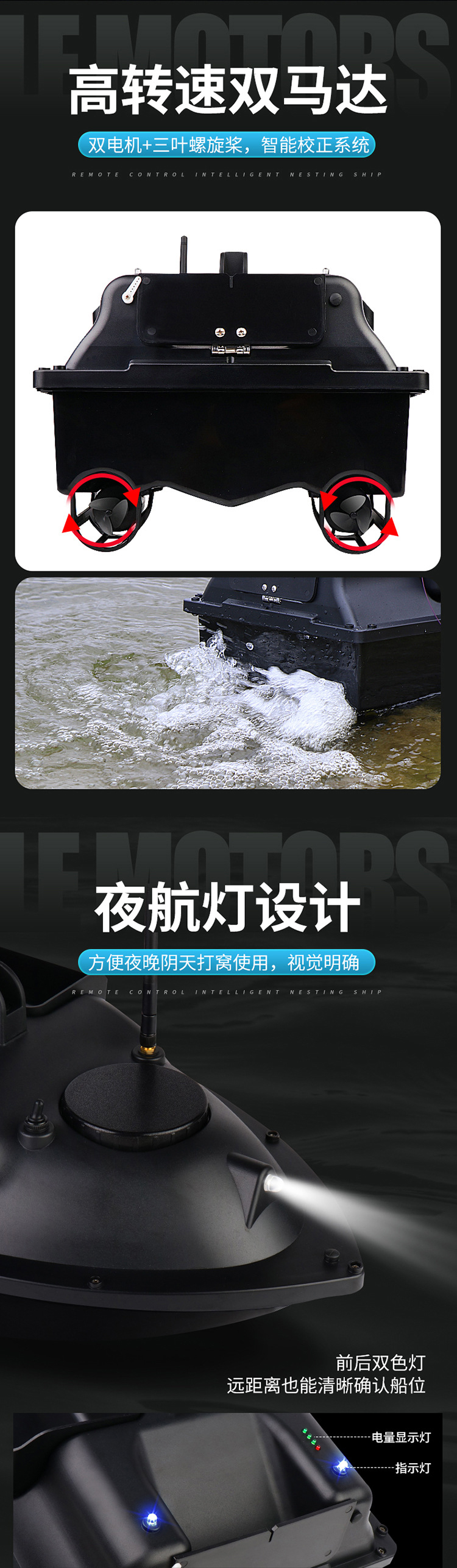 2.CPS one-key return version: The GPS version uses an LCD two-hand remote control with cruise control function, remote control boat lights, and hull battery indicator lights. The three cabins can be controlled and opened independently. The battery is 7.4 V 5200mA and can be used continuously for about 2 hours. . The remote control can set a one-click return point. In addition, you can set any 3 anchor points and move back and forth between the 3 points. After setting the origin, if the signal is lost or the battery is low, the ship will automatically return after 15 seconds, and the remote control LCD screen will display the ship's power, compass and sailing meters.