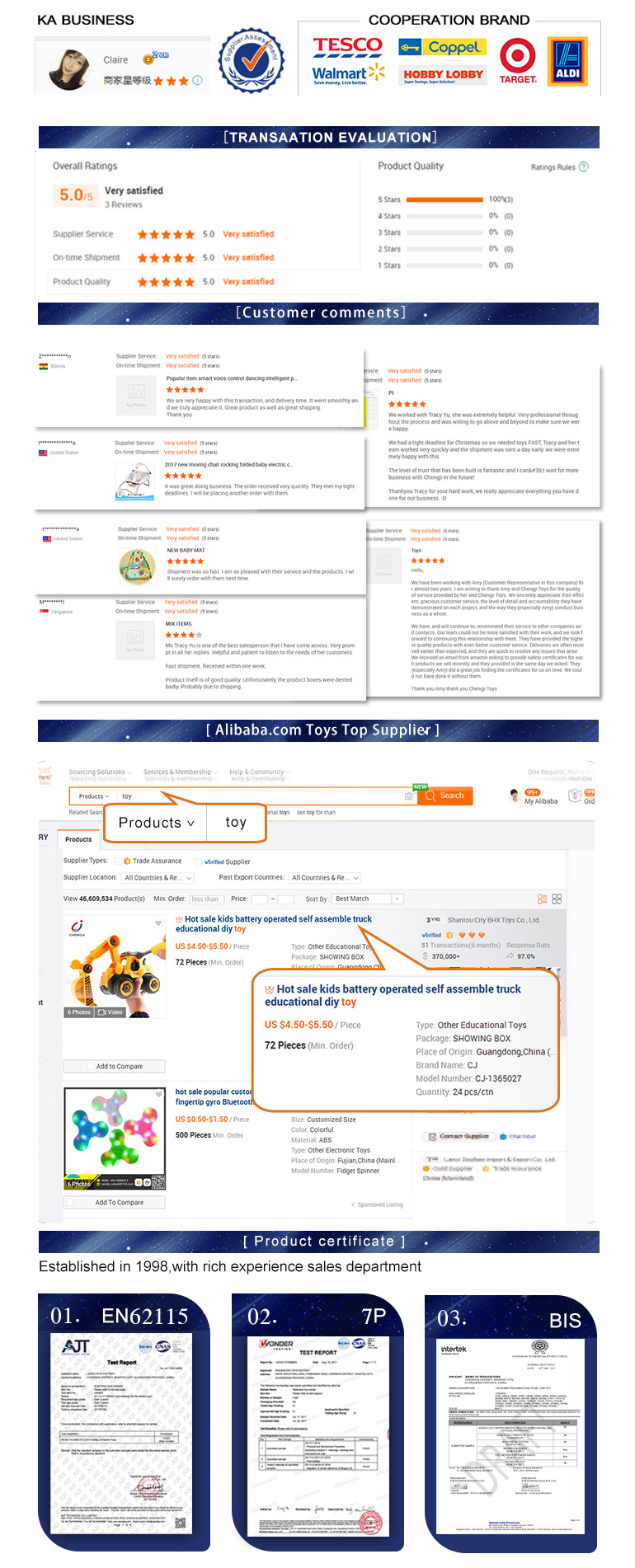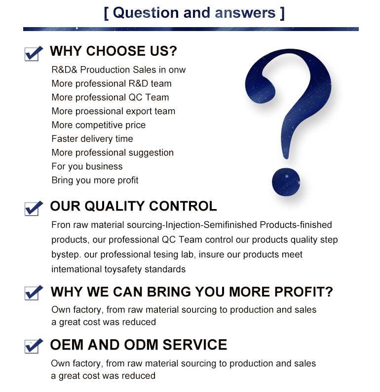 Service 1.Help to search toys for markets sales 2.Offer FCL/LCL/OEM/ODM price 3.Suggest shipment methord 4.Support to lower MOQ to meet the market testing 5.Welcome to contact us! |