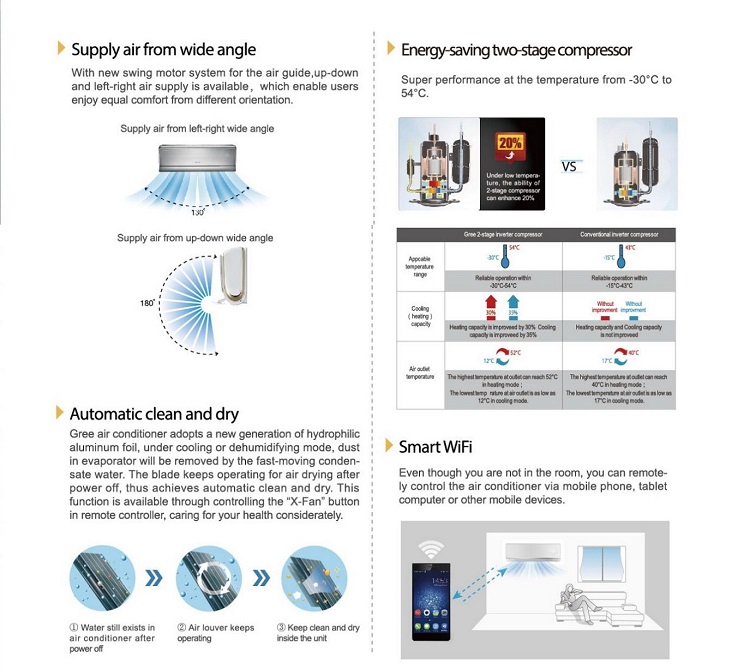 Gree's two-stage compressor can also perform normal heating and cooling under extreme temperatures without increasing power consumption. When the ambient temperature is -20°C, the air outlet temperature can reach 50°C, and when the ambient temperature is 50°C, it can reach 13°C.