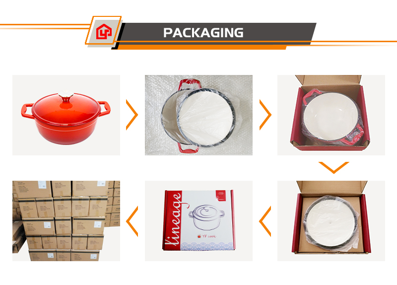| Packaging Details: | 1. Put the cast iron enamel casserole into a plastic bag to avoid dust. 2. Place the cast iron enameled casserole in a small paper box (brown or colored). 3. Put several small boxes into one big cardboard box. | usage: | kitchen chef |