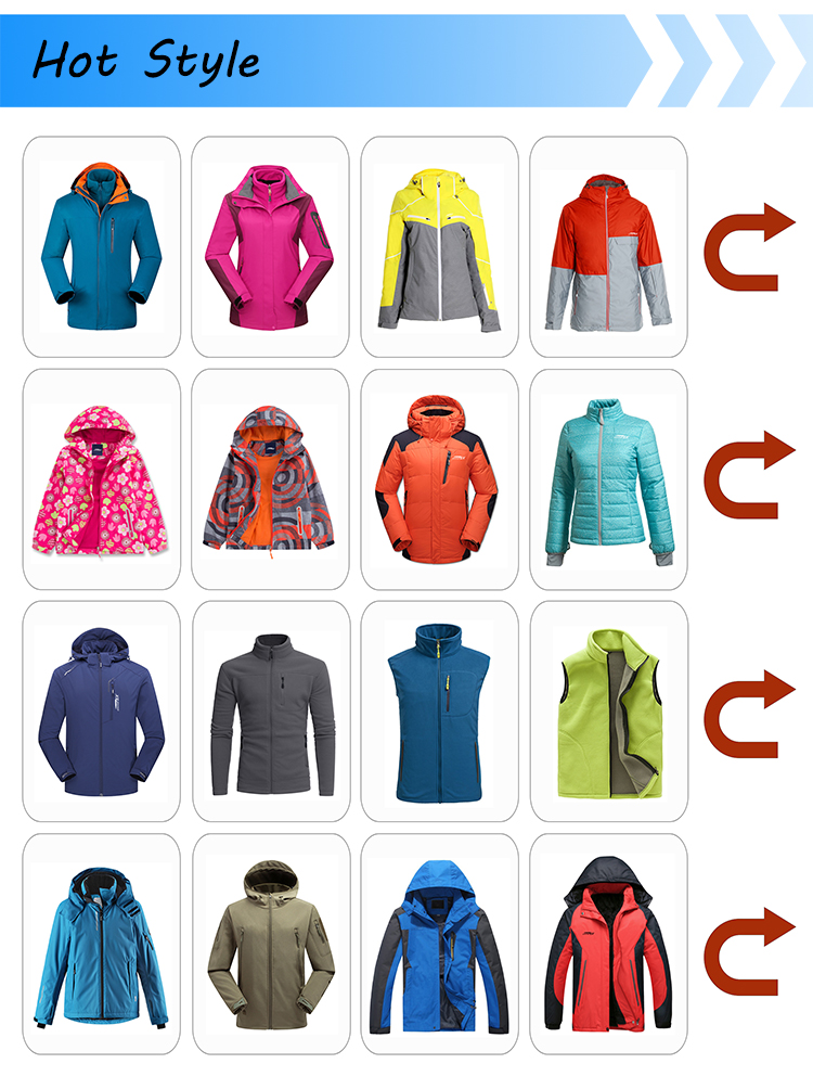 A: Main products: ski jackets, soft shell jackets, fleece jackets, 3-in-1 jackets, padded jackets, sportswear, windbreakers and raincoats.