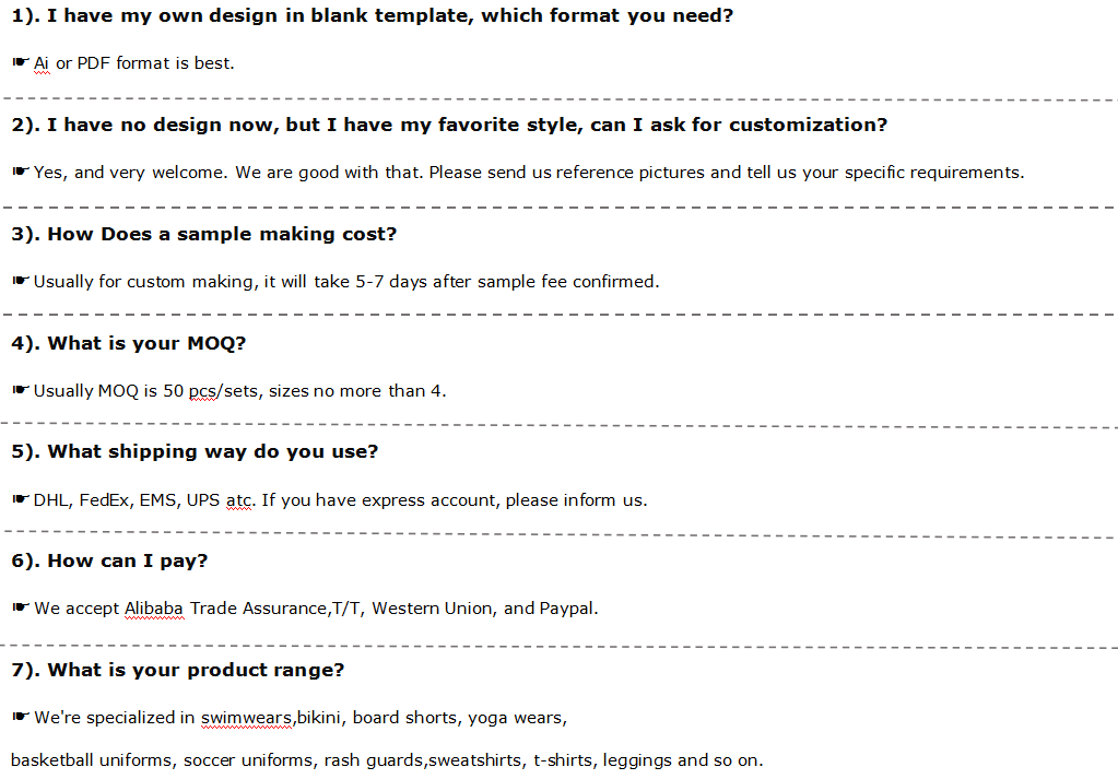 | Bulk Production Time: | About 15 working days; | Size: | based on customers' size chart; |