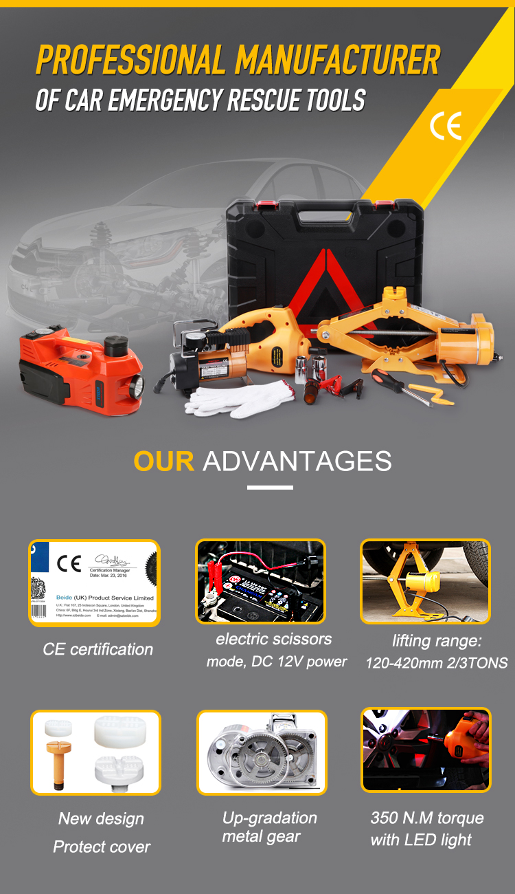 Hot Selling CE ISO 3in1 DC12V 3T Durable Electric Screw Scissors Car Jack and Torque Wheel Impact Wrench and Tire Inflator