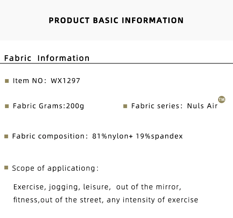 | Fabric Features: | Breathable, durable, moisture wicking, quick-dry, great stretch, comfortable, flexible |