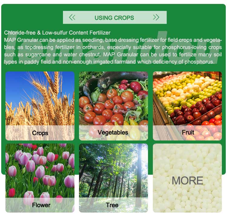 Monoammonium phosphate (MAP) is commonly used universal fertilizer and a concentrated granulated fertilizer of low nitrogen content (in ammonium form) and high phosphorus content (soluble in neutral ammonium citrate). Monoammonium Phosphate (MAP) is also known as Ammonium Dihydrogen Phosphate (ADP), easy soluble in water and anti-cacking.
