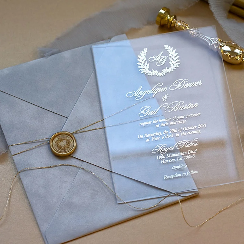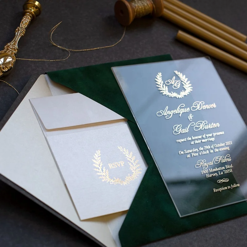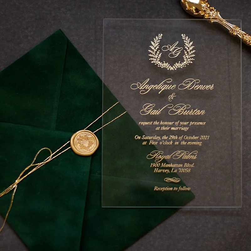 Hot sale Muslim clear acrylic wedding invitation cards with velvet envelopes