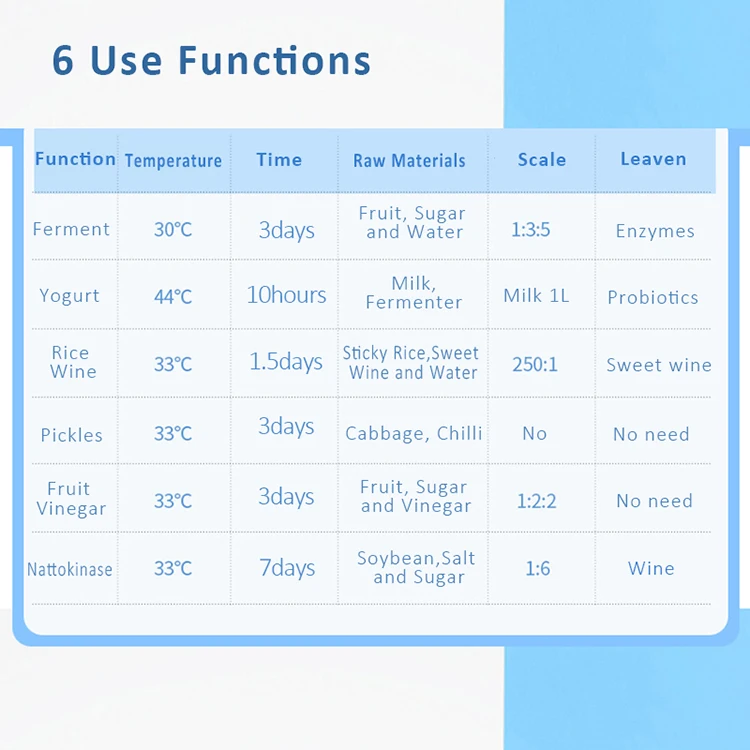 Version 1:8 functions,Enzyme/Black Garlic/ Natto/Yogurt /Pickles /Rice Wine /Fruit Vinegar/ Leaven Dough .