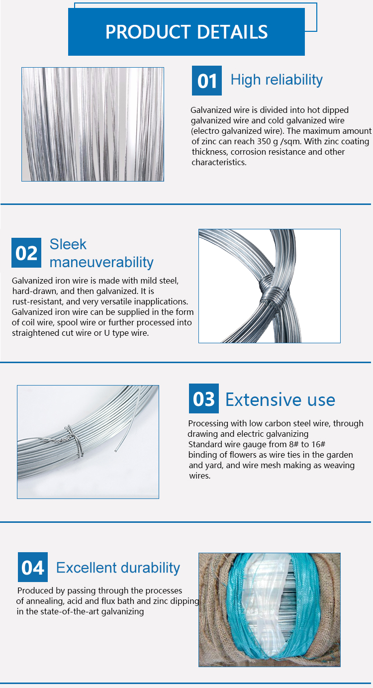 Galvanized wire,Also called cold galvanized wire, it is made of high-quality carbon steel wire. The processing of this wire is galvanized using electrolytic equipment. In general, the zinc coating is not very thick, but the electro-galvanized wire has sufficient corrosion resistance and oxidation resistance, and the surface of the galvanized layer is very even, smooth and bright. Galvanized galvanized wire is generally 8-50g/m2. Mainly used in the manufacture of nails and wire ropes, wire meshes and fences, tied flowers and wire mesh weaving.