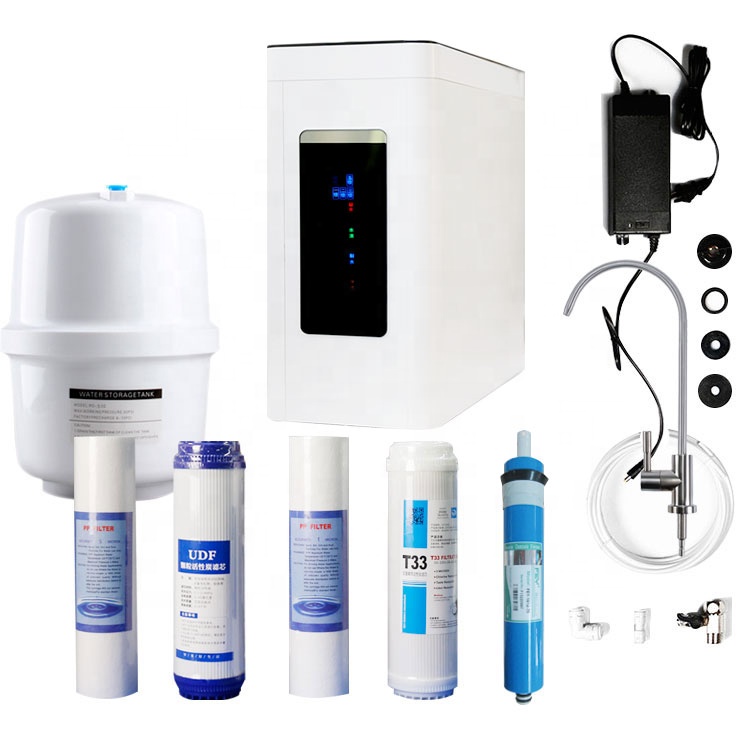 | filter type | 5μm pp + granular activated carbon + 1μm pp + 75gpd RO + post activated carbon (+mineralization+alkaline+selenium rich) | ||