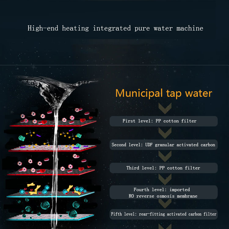 3. Five-stage filtration: 5μm pp+granular activated carbon+1μm pp+75gpd RO+rear activated carbon