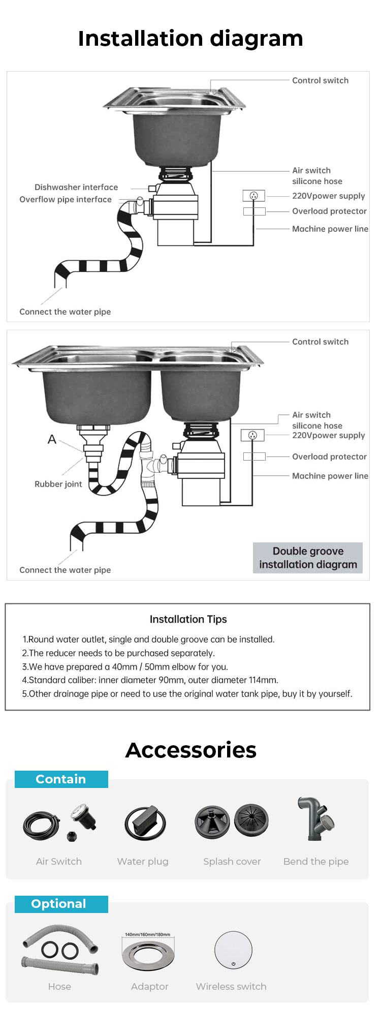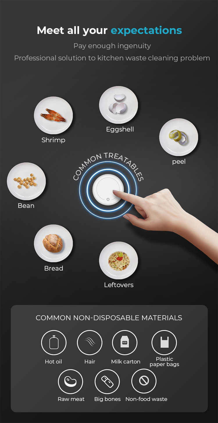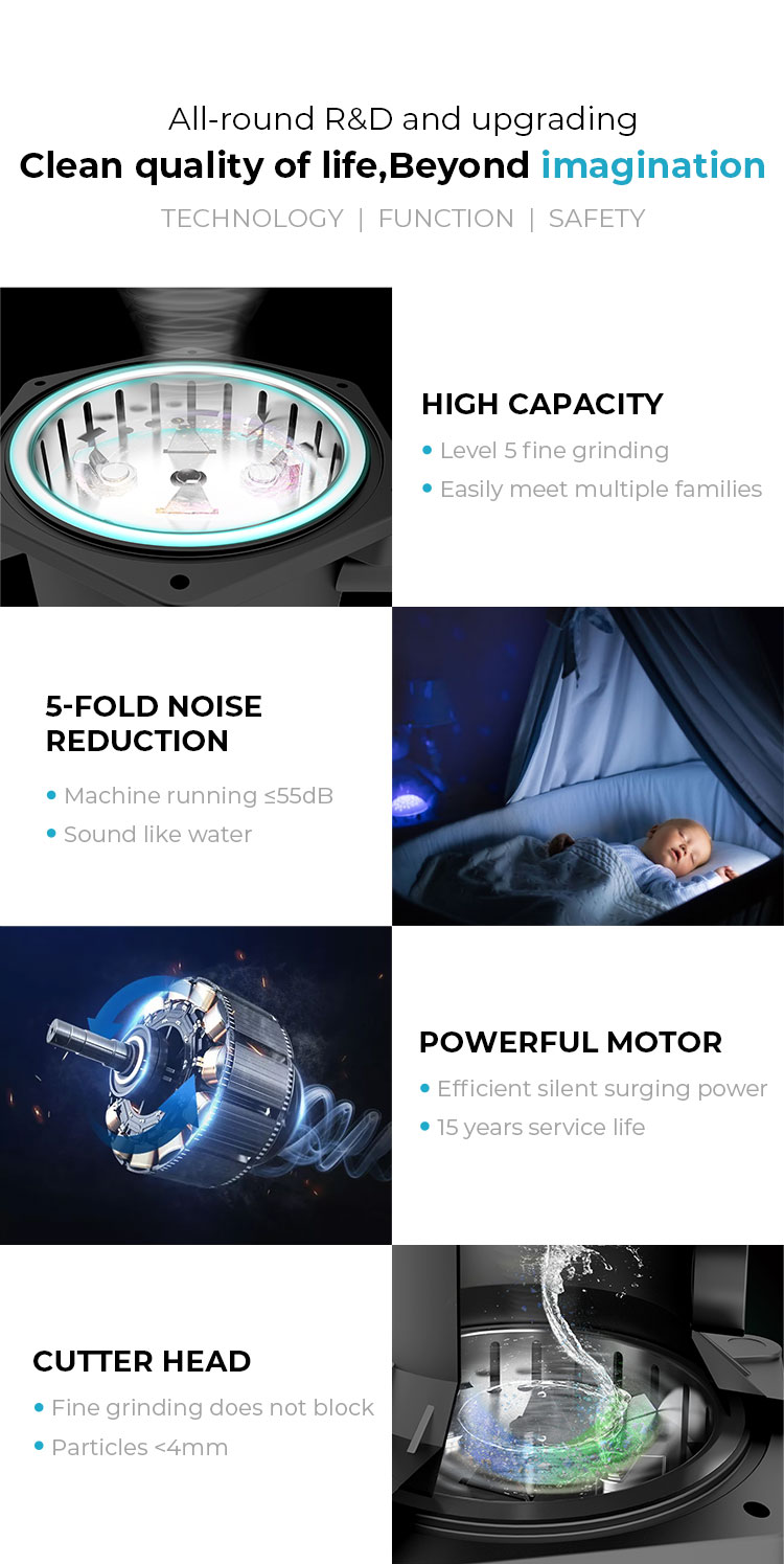 | feature: | Air switch control, automatic reverse grinding system, dishwasher-safe, overload protector, sound insulation, stainless steel grinding elements |