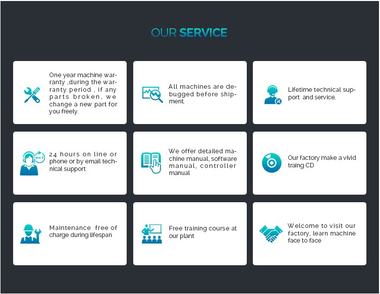 In addition, you will be able to get free training advice on our machines at our factory. You will also get free advice and consultation, technical support and services by email/fax/telephone etc.