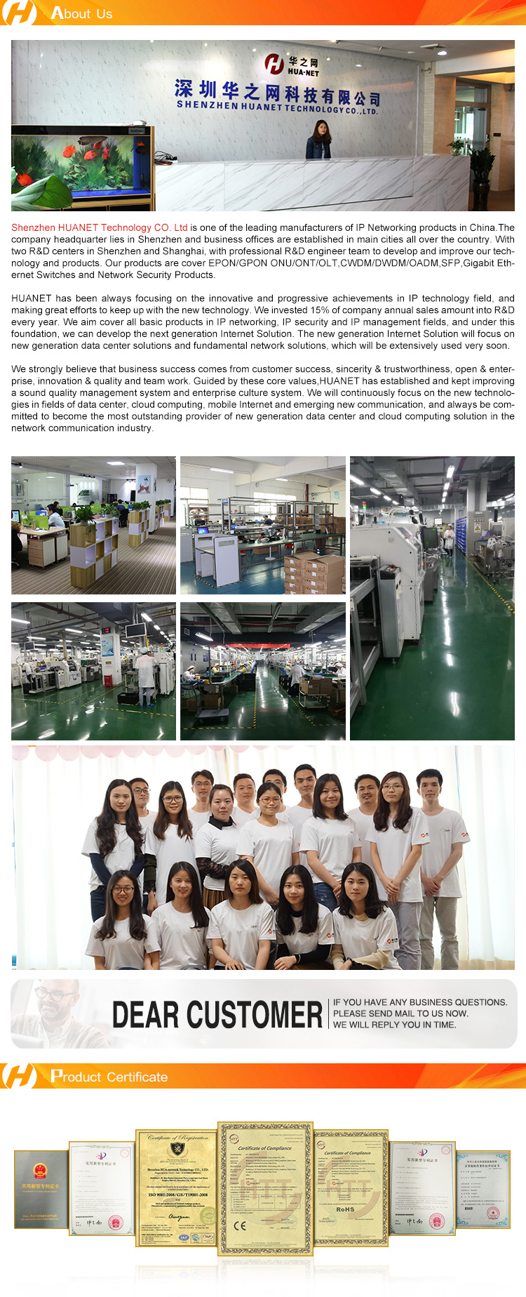 For all EPON and terminal equipment, Ethernet switches and other products, Huawang promises: Lifetime technical support: Provide lifetime free telephone and E-mail technical support for every network product sold. Software upgrade for life: Provide customers with upgraded software in the form of E-mail or CD, which can be downloaded from the customer service network.