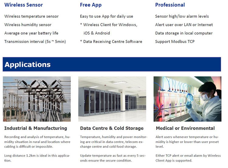 The sensor transmits analog sensor readings wirelessly to the base station via radio frequency up to 1200 meters. Its internal battery runs for an average of one year. All sensors are waterproof and internal/external antennas are adjustable.