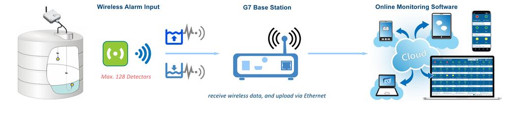 The Wireless Sensor G7 wirelessly transmits measurements from any industrial analog sensor with a 4-20mA/0-5VDC signal to the base station. The base station collects all wireless sensor readings and periodically uploads them to a central server via the Modbus TCP protocol.