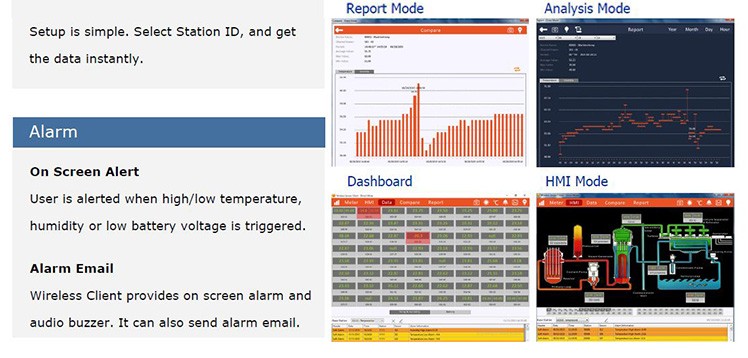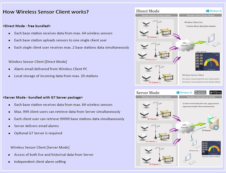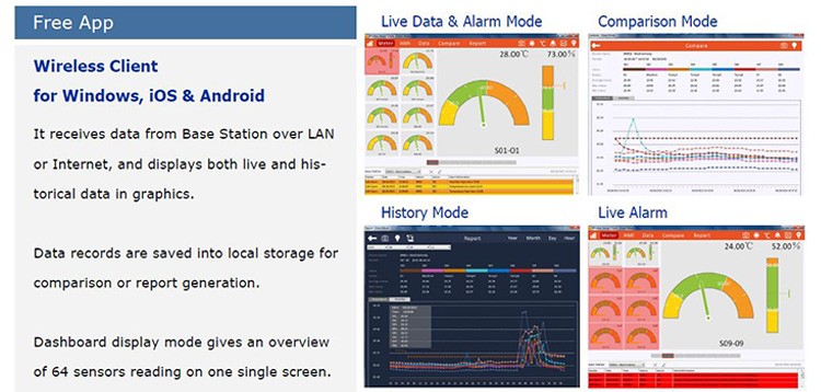 By using the free G7 Client Lite, users can receive data from base stations via LAN or the Internet. Data will be saved to a file for future analysis and displayed graphically with real-time alarm alerts.