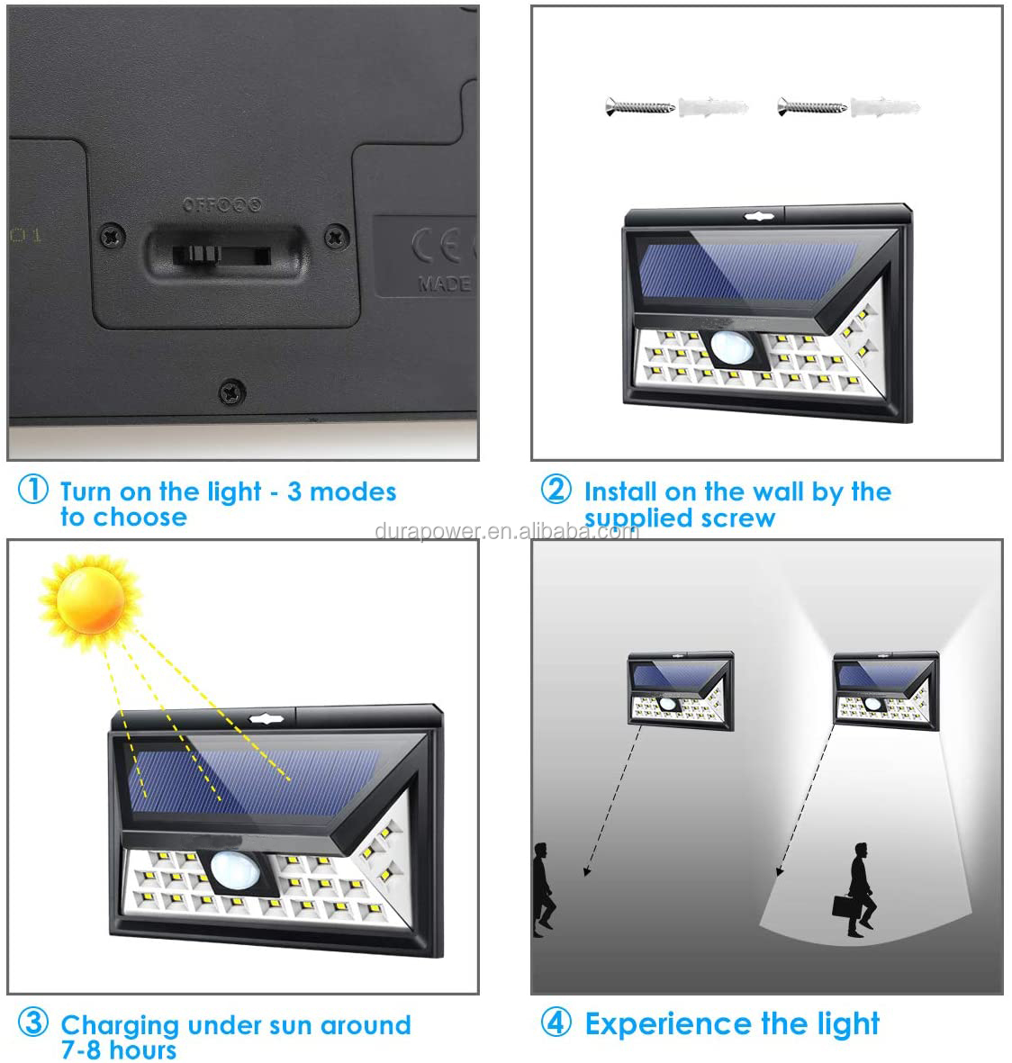 3. Induction mode: charging during the day. Automatically turn on the strong light in the dark or at night when motion is detected and lasts about 16-20 seconds. When there is no movement, the light turns off.
