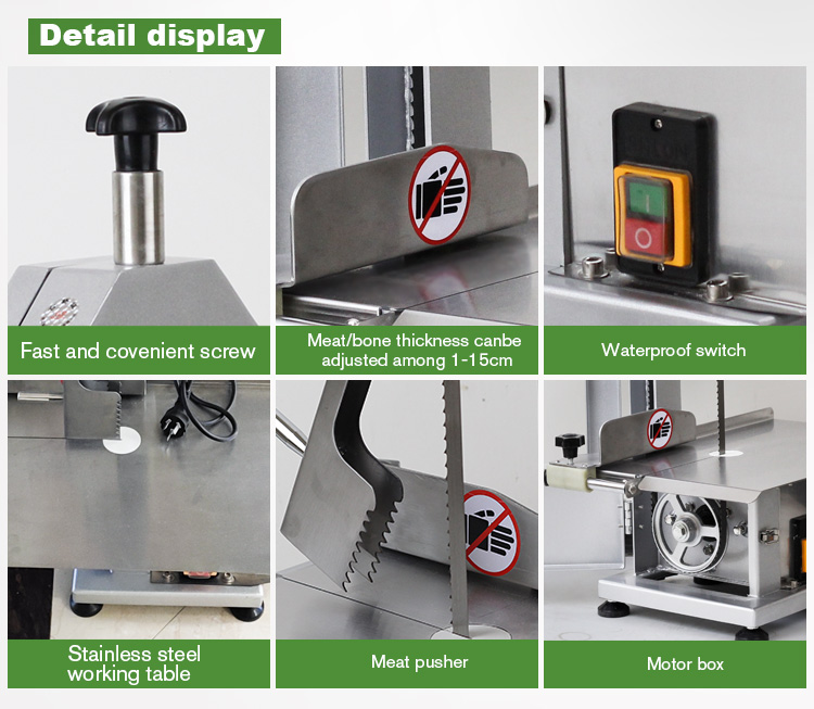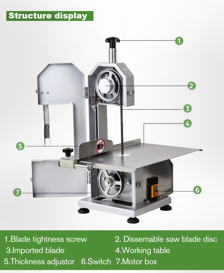 7. Large horsepower, compact structure, beautiful appearance, simple operation, high efficiency, low power consumption, convenient cleaning and maintenance, and good bone sawing effect.