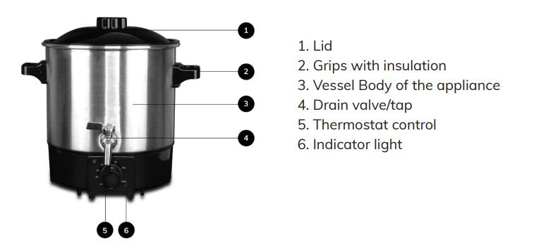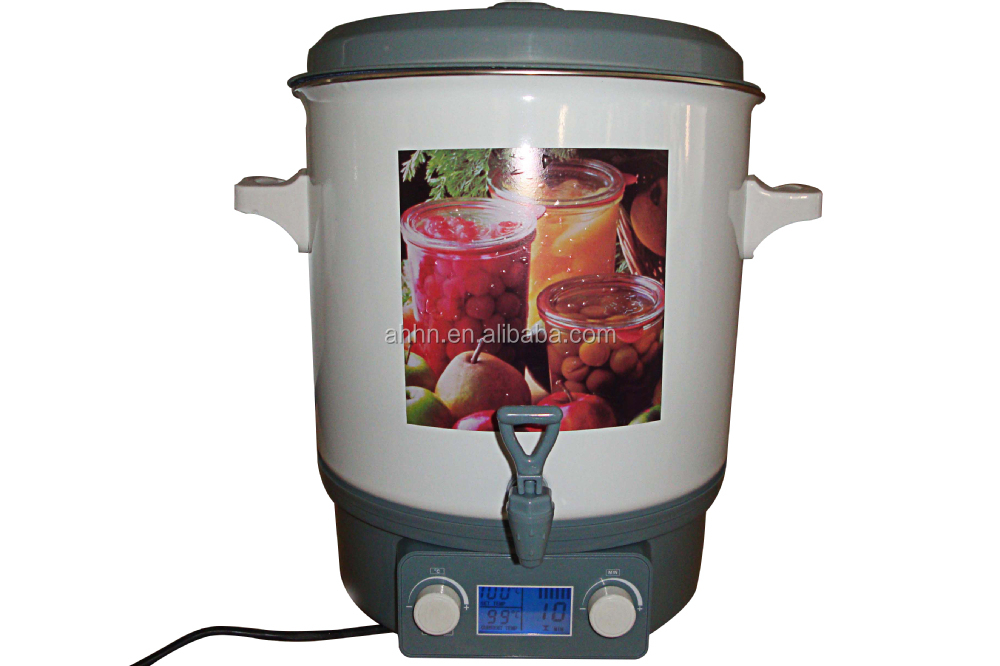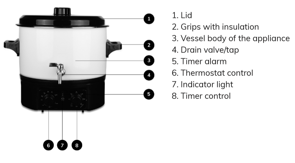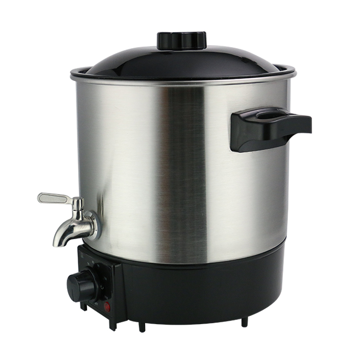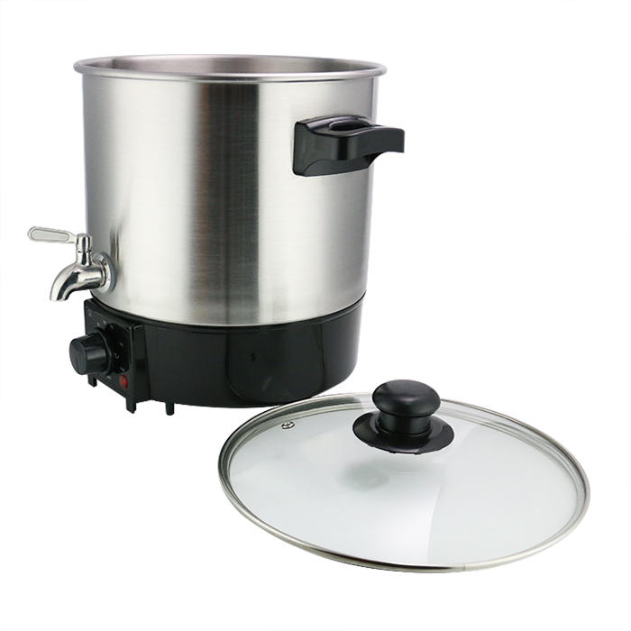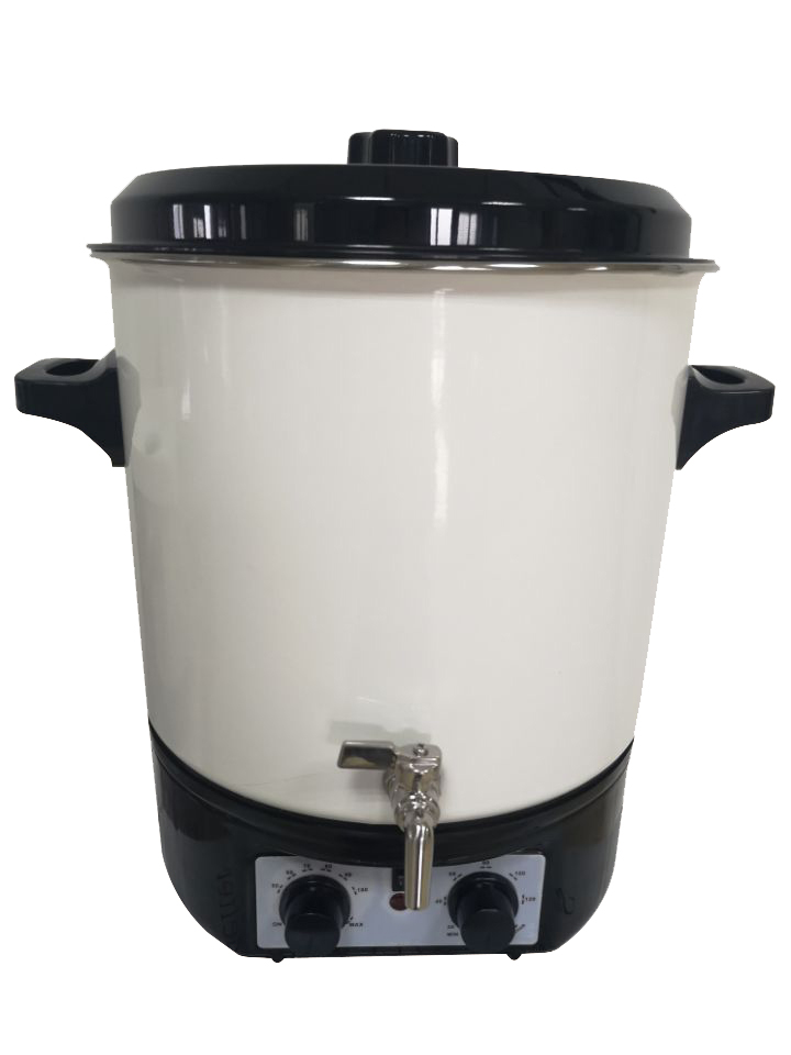 | Material | Stainless steel pot or durable enamel-coated white pot with cable compartment on bottom, plastic handle, stainless steel or plastic tap, plastic or glass lid. Timer, temperature control and display are all available. |