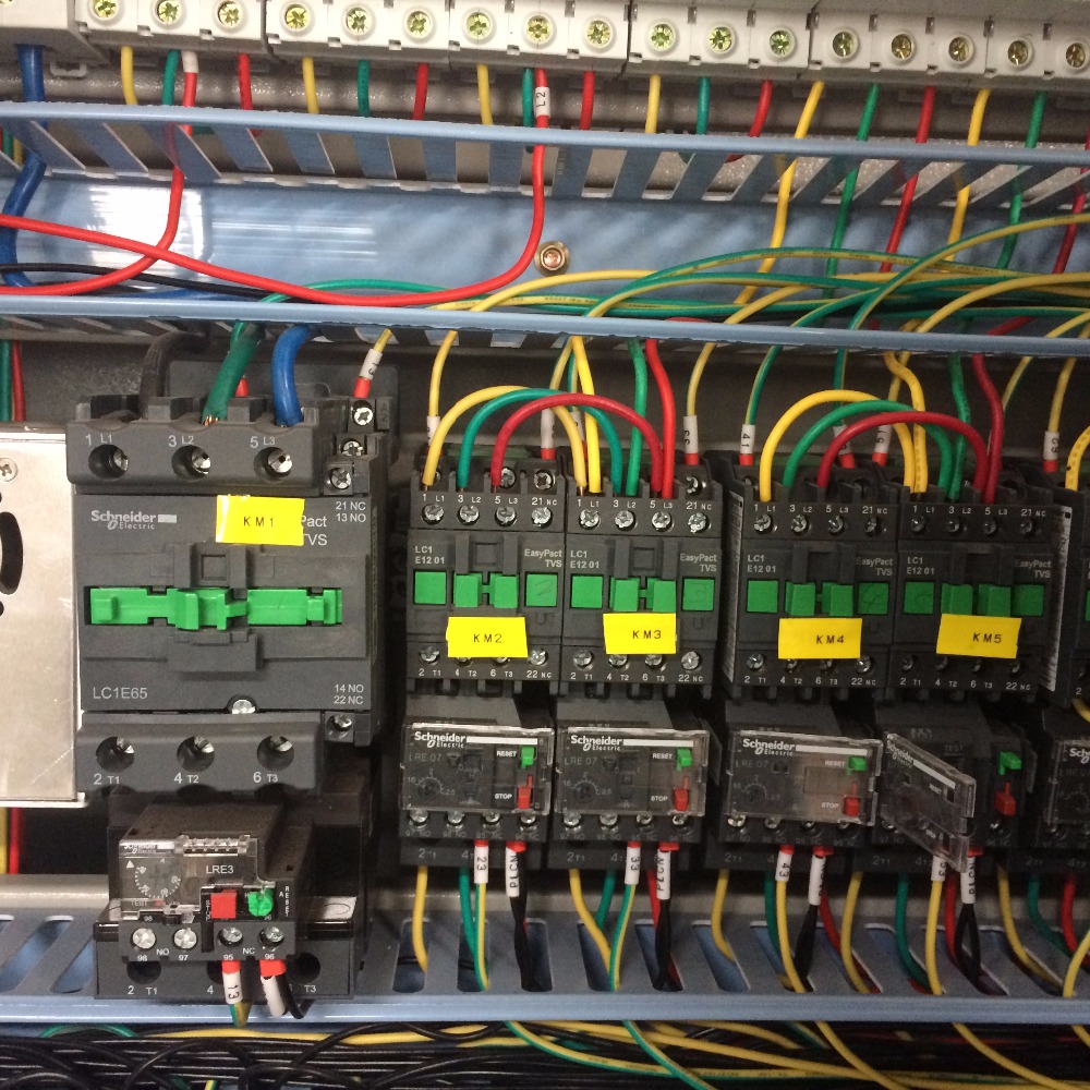 The machine is equipped with a common panel in which all programmable and electromechanical components are installed and interconnected, such as PLCs (Programmable Logic Controllers), computers, contactors, motor circuit breakers, power supplies, transformers, VFDs (Variable Frequency Drives), Buttons, selector switches and light/sound alarms. This panel is mainly used to set recipe parameters for production.