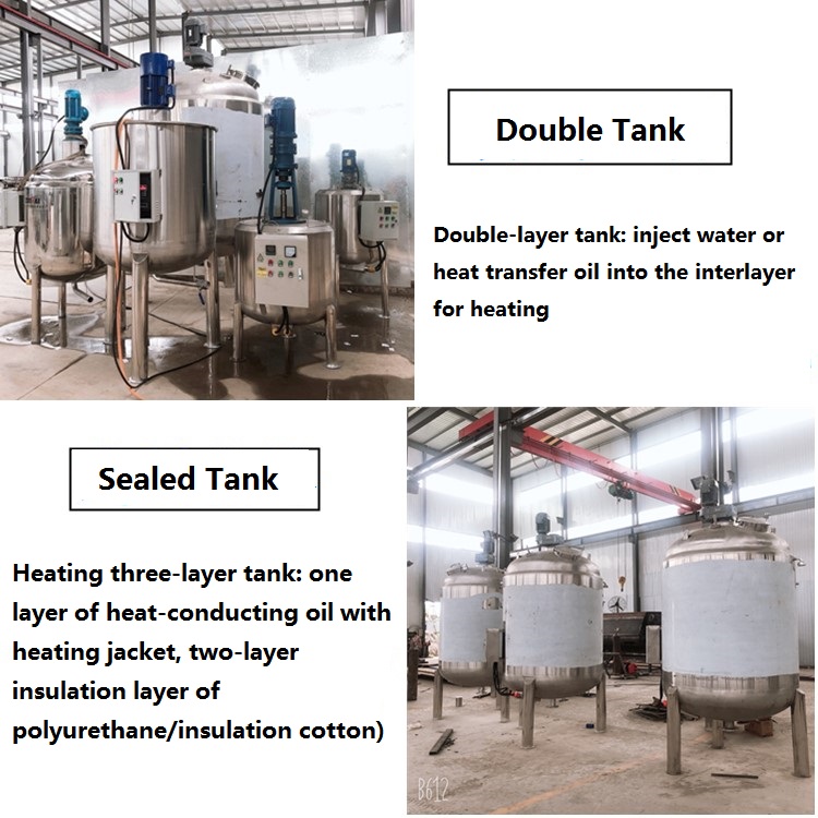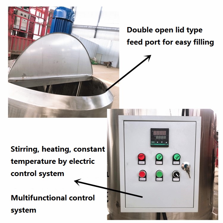 Functions and features of electric heating stirring tank: Heating (the medium in the jacket is heated by the electric heating tube, the material in the tank is indirectly heated through the transfer of heat energy, and the temperature is automatically controlled), heat preservation, cooling and stirring.
