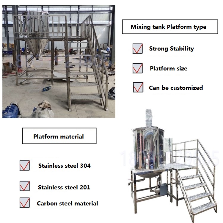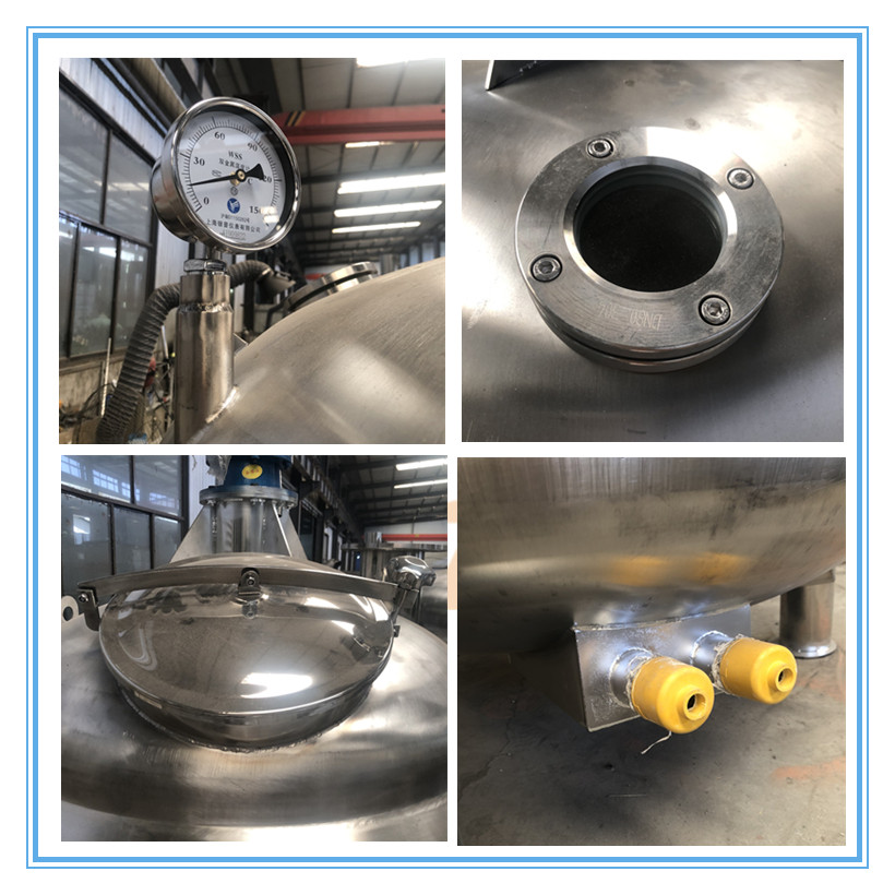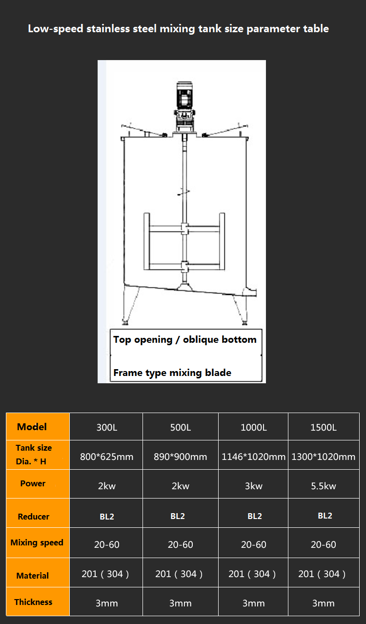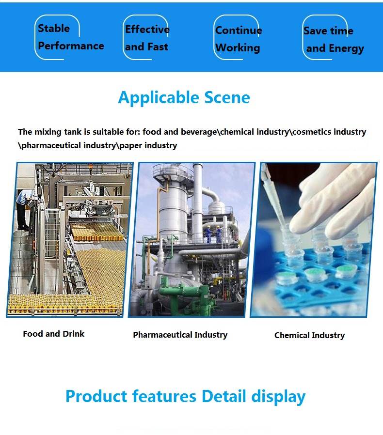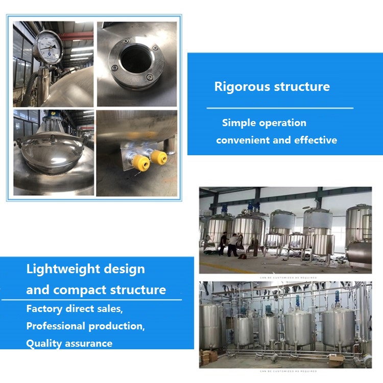 The design and manufacture of the entire electric heating mixing tank meets strict requirements, and achieves the goals of economy, safety, efficiency, sanitation, thorough cleaning, and convenient disassembly and washing, and has been recognized by users. Equipment structure: upper flat cover with double opening, lower head, bottom discharge, vertical three legs.