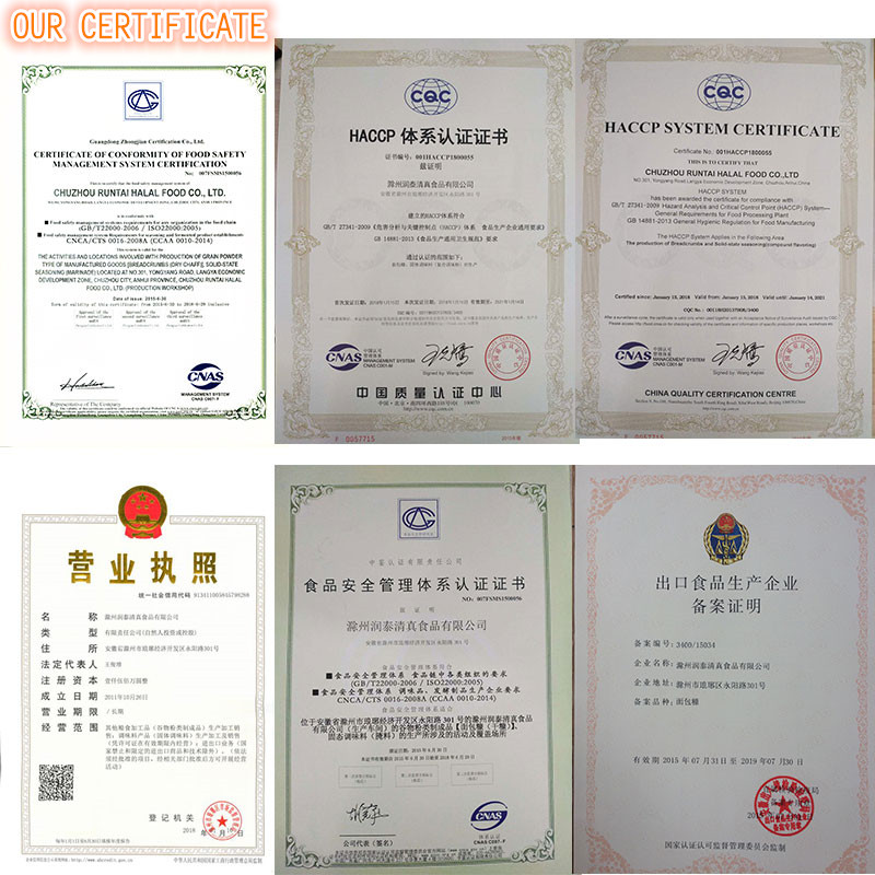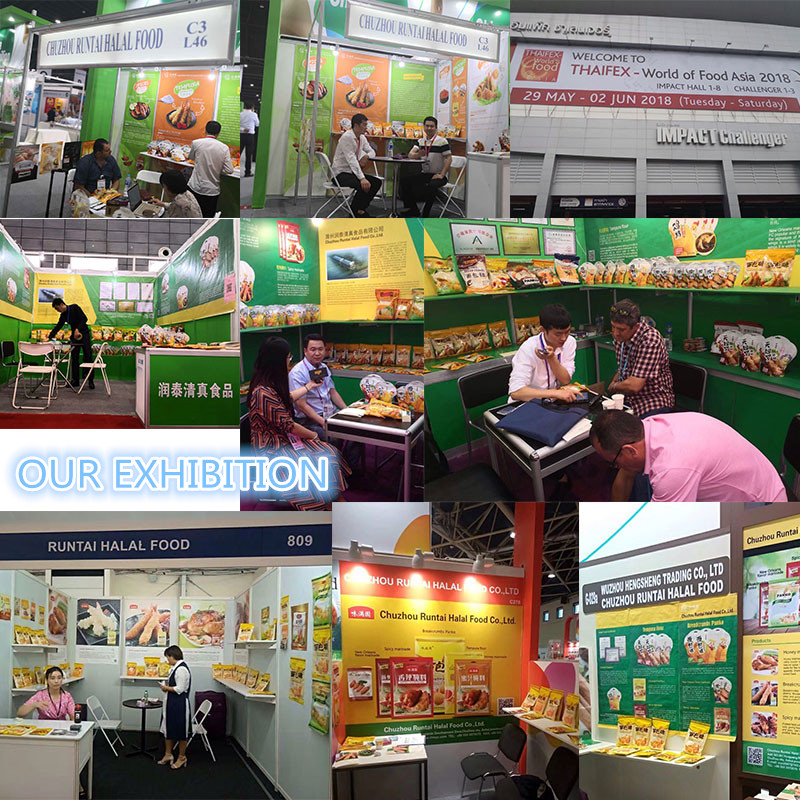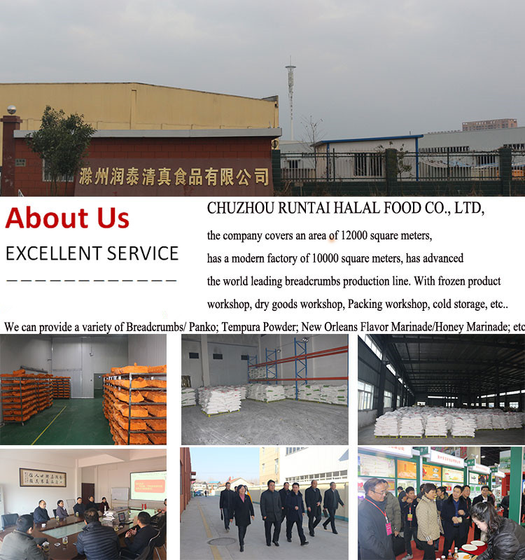 A:Chuzhou Runtai Halal Food Co., Ltd., the company covers an area of12000 square meters, with modern workshop 10000 square meters, with advancedThe world's leading bread crumb line. With frozen product workshop, dry goods workshop,Packageworkshop, cold storage, etc.We can provide a variety ofBreadcrumbs/Panko; Tempura Powder; New Orleans-Style Marinade/Honey Marinade;ETC.