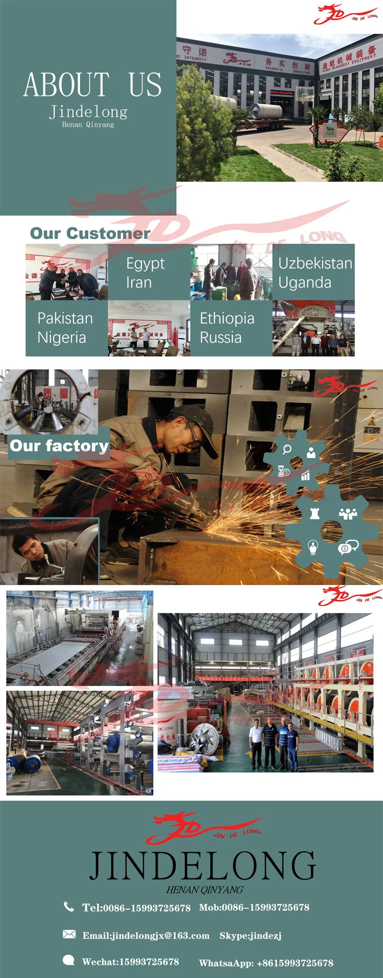 We are Qinyang Jindelong Paper Making Machinery Factory, providing toilet paper machine and processing equipment/ kraft corrugated paper/ cultural paper/ coated paper/ paper board/ testliner machine and related parts/ raw material, can accept customized.