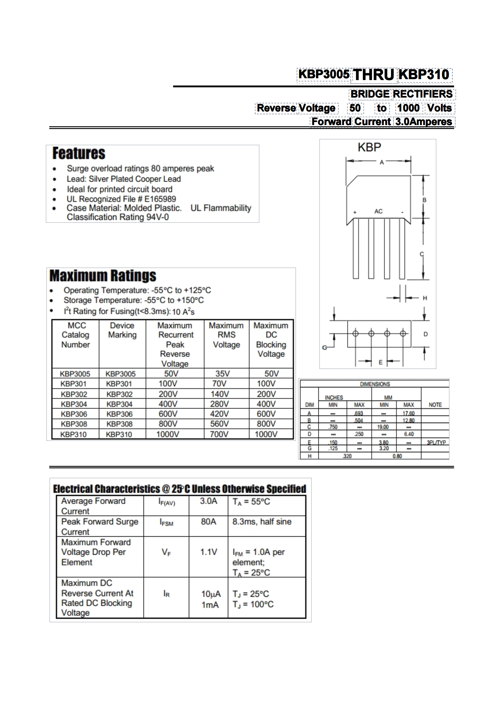 | Diode type: | bridge rectifier diode | series: | Potassium BP |