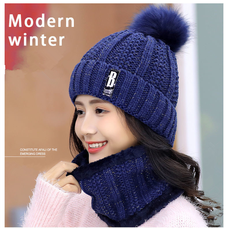 | product name | Knitted Padded Hat 2-Pack Ski Warm Skull Fur Pom Pom Beanie Round Neck Scarf Women Fleece Lined Women Winter Hat and Scarf Set |