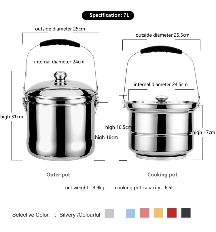 | Packaging details: | Specifications: 7L/9L Color box size: 300*300*355mm/325*325*335mm Carton size: 910*310*690mm/660*330*690mm Packaging details: 6 pieces/box, 4 pieces/box Product weight: 3.9 kg/ 4.3 kg Packing weight: 28 kg/20.5 kg | Inner pot: | Stainless steel 201 |