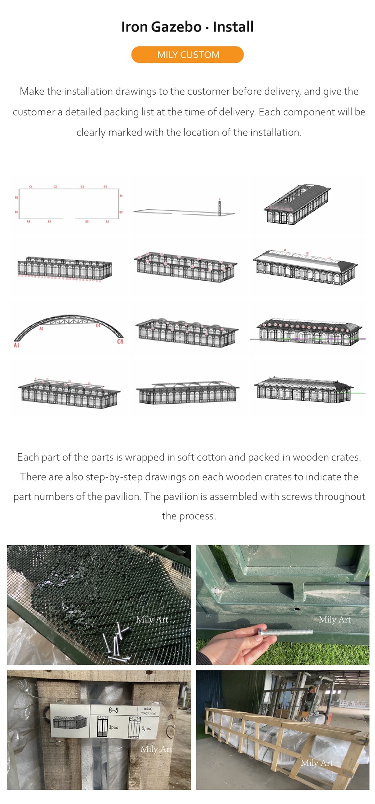 >>Every part of the parts is wrapped with soft cotton cloth and packed in a wooden case. and alsostep by step drawingsMark the part number of the pavilion on each wooden box. Throughout, the pavilion was assembled with screws.