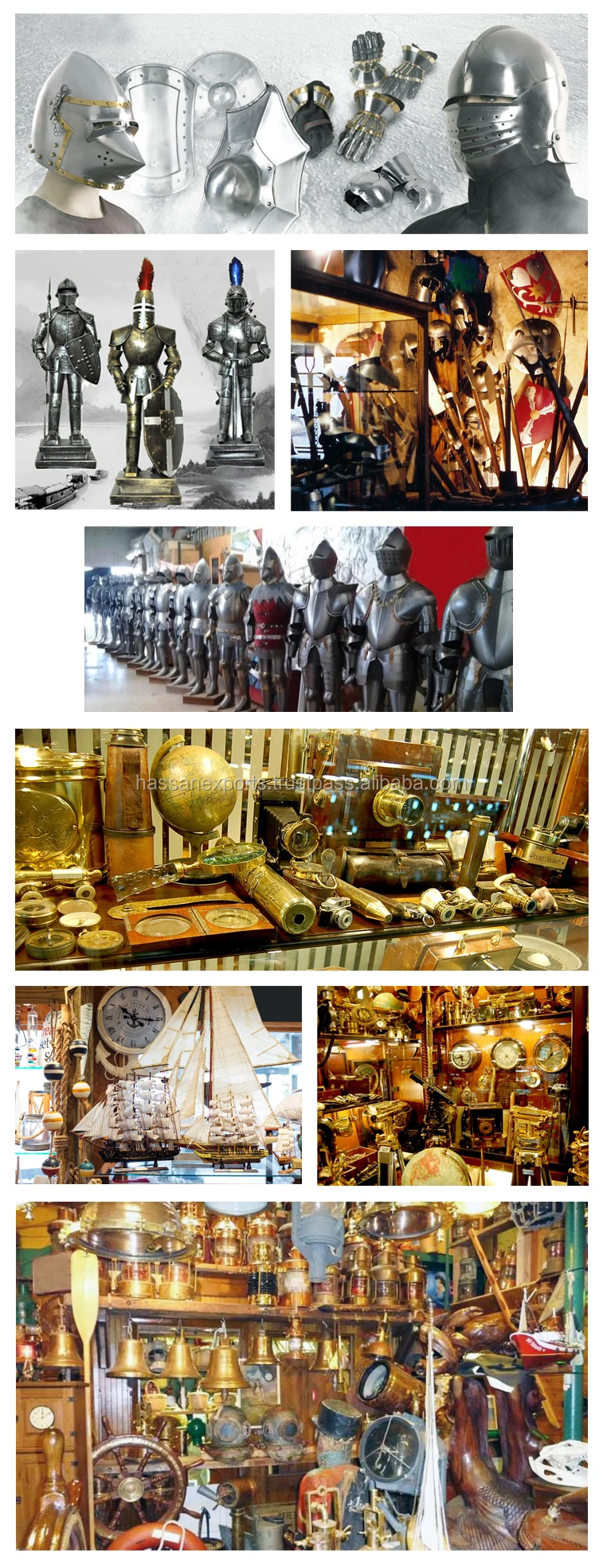 We manufacture a wide variety of products including medieval armor such as armor helmets, armor sets, chainmail, gauntlets, breastplates, shields, swords, axes, etc., nautical gifts such as binoculars, sextants, ship clocks, ship lights, Ship wheel, porthole, compass, nautical clock, key chain, diving helmet, diving helmet clock, anchor, fishing buoy, timer, magnifying glass, etc., lock, ball and chain, flail, handcuffs, legcuffs, lighthouse, lamp, brass antique replicas of idols, vases, etc.