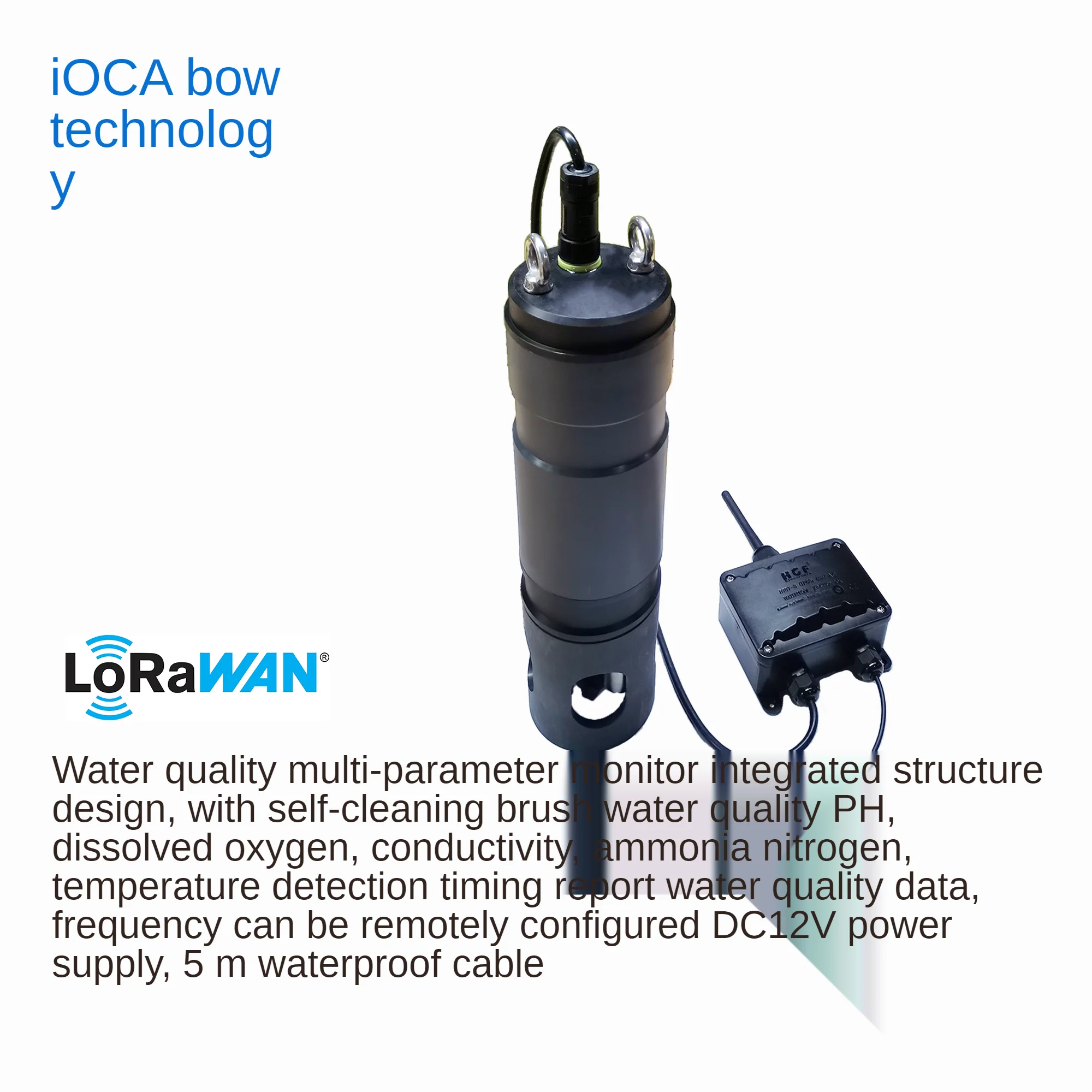 Water quality multi-parameter monitor integrated structure design, with self-cleaning brush water quality PH, dissolved oxygen, conductivity, ammonia nitrogen, temperature detection timing report water quality data, frequency can be remotely configured DC12V power supply, 5 m waterproof cable