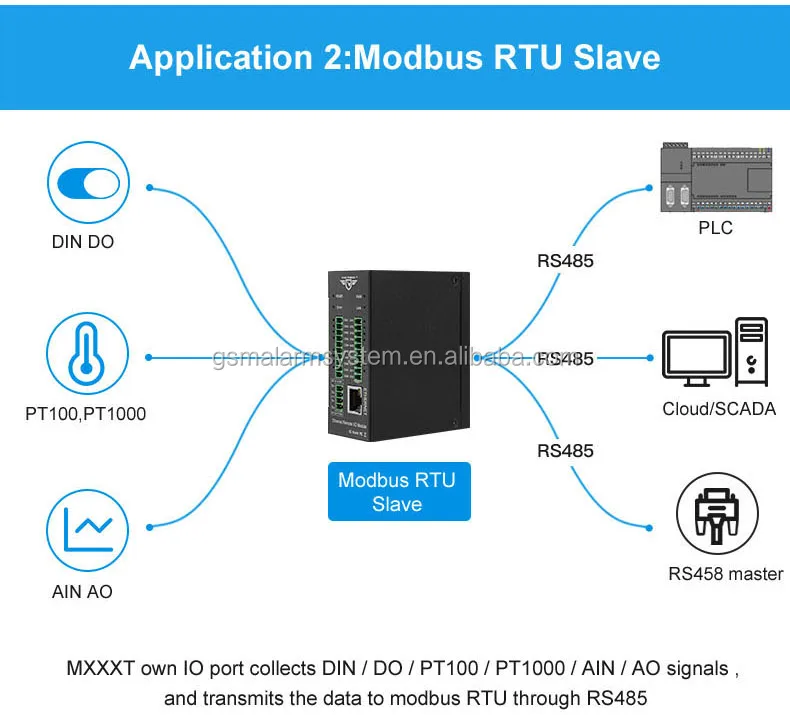 he M120T Ethernet Remote I/O module provides a RS485 interface, through the RS485 bus, it can cascade Modbus RTU I/O devices or Modbus RTU meters, e.g.: a variety of digital input or digital outputs, analog inputs or outputs, thermal resistance IO module combination, save costs. At the same time, the Ethernet Remote I/O module has register mapping function, the cascade Modbus RTU I/O data are automatically collected to the mapping memory area, the Modbus TCP Client query without waiting then can get a quick response to meet the industrial timely requirements.