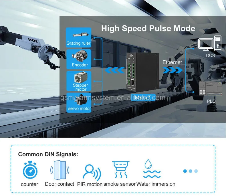 The M120T Ethernet Remote I/O module provides 4 optical-isolated digital inputs, supports 1~300KHz high speed pulse counter, 4 isolated 12bits analog inputs, supports 0~5V,0~10V,4~20mA,0~20mA analog signal, 4 digital outputs, supports 1~300Khz high speed pulse output or relay outputs, 2 channel 12bits analog outputs, supports 0~10VDC signal output. All of the I/O with high sampling frequency and special filtering strategy to ensure it’s reliable.