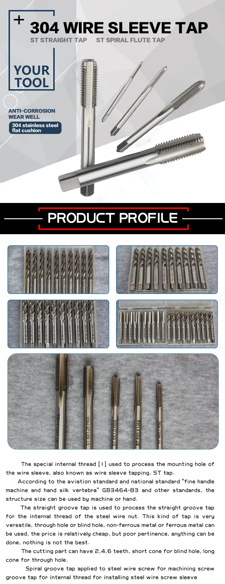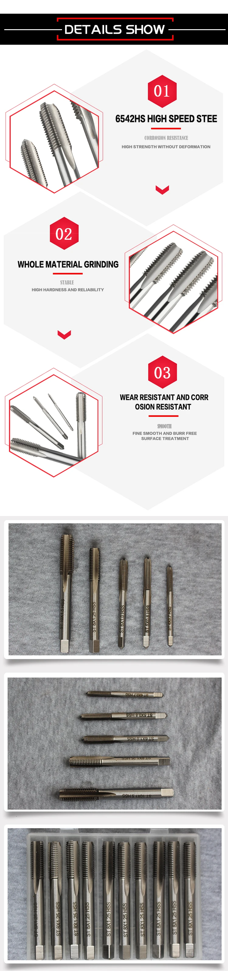 | Size: | ST 10X1.5,ST 8X1.25,ST 6X1.0,ST 5X0.8,ST 4X0.7; | Material: | HSS; |