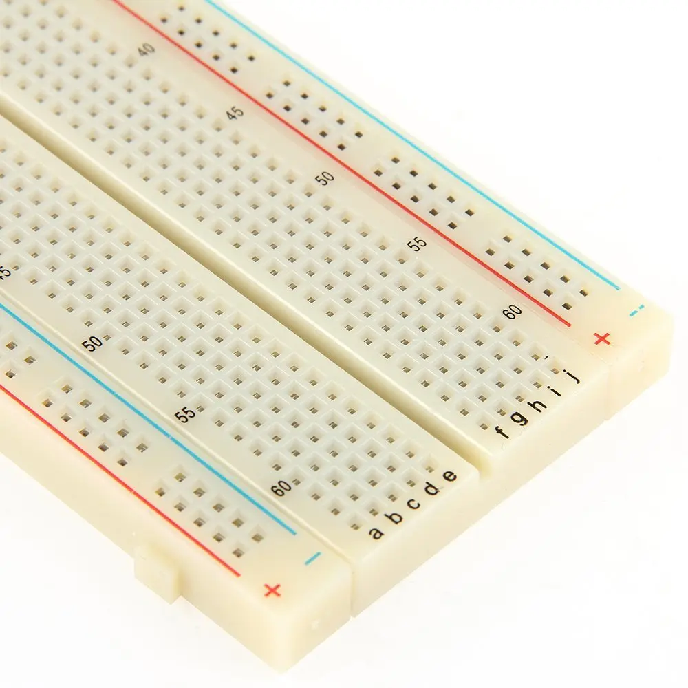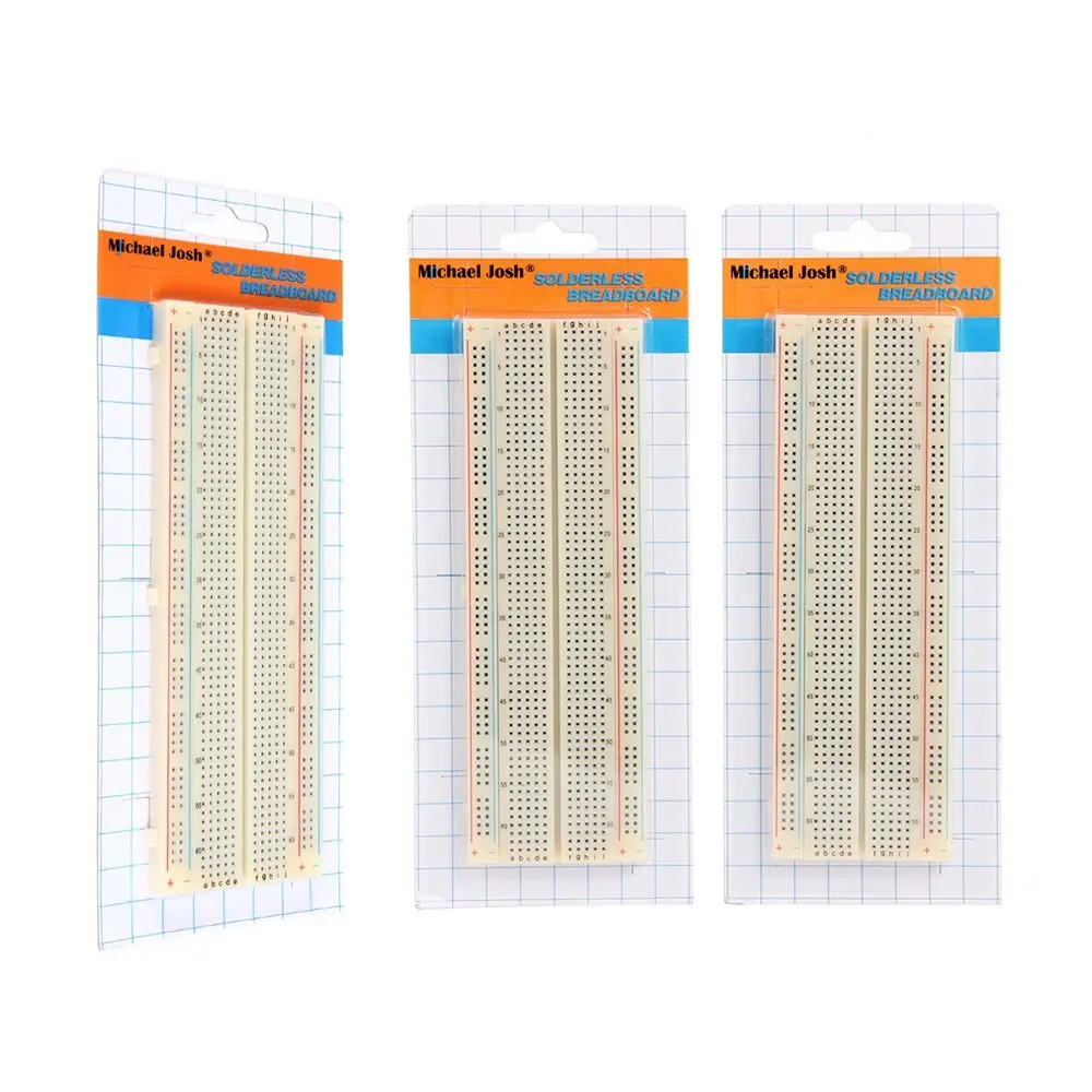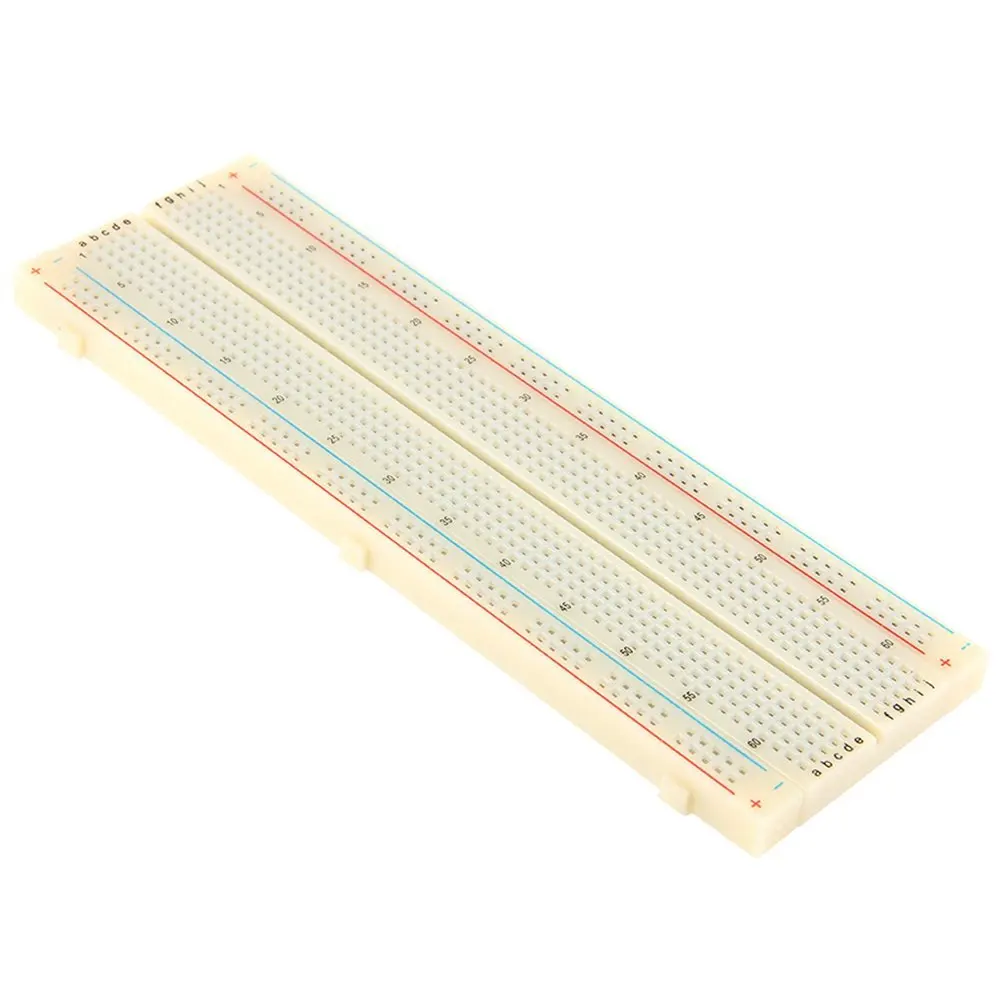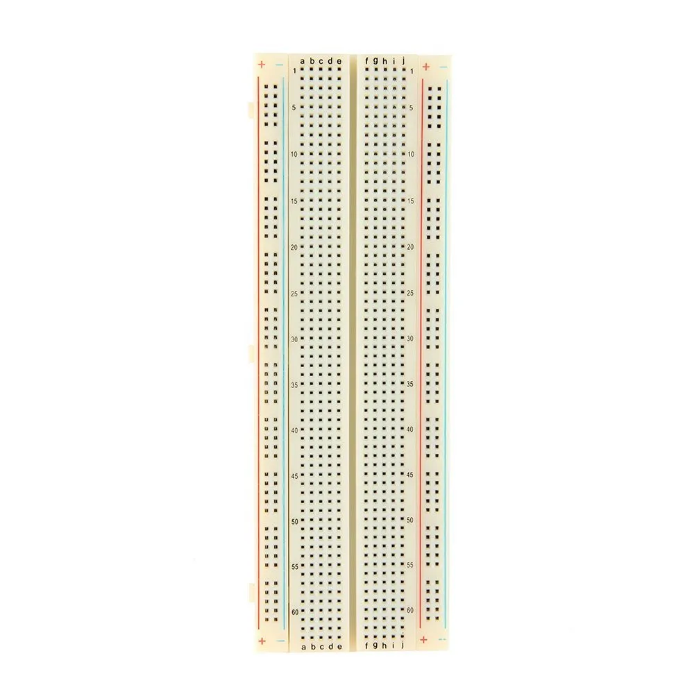 The Breadboard 830 is a solderless (plug-in) breadboard with 830 connection points (ie 830 holes for insertion of wires).