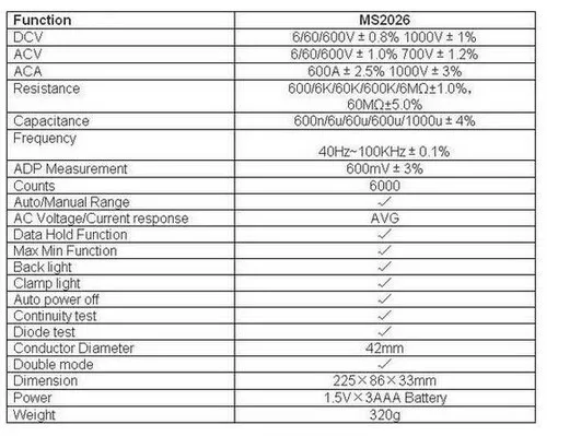 | power supply: | 1 X 9V 6F22 battery | model: | MS2115A Digital Multimeter |