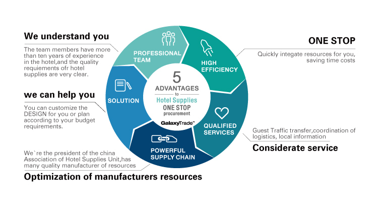 Founded in 2006, Galaxy specializes in providing one-stop hotel supplies with ISO9001 quality assurance: hotel room supplies, bathroom supplies, hotel lobby supplies, etc.