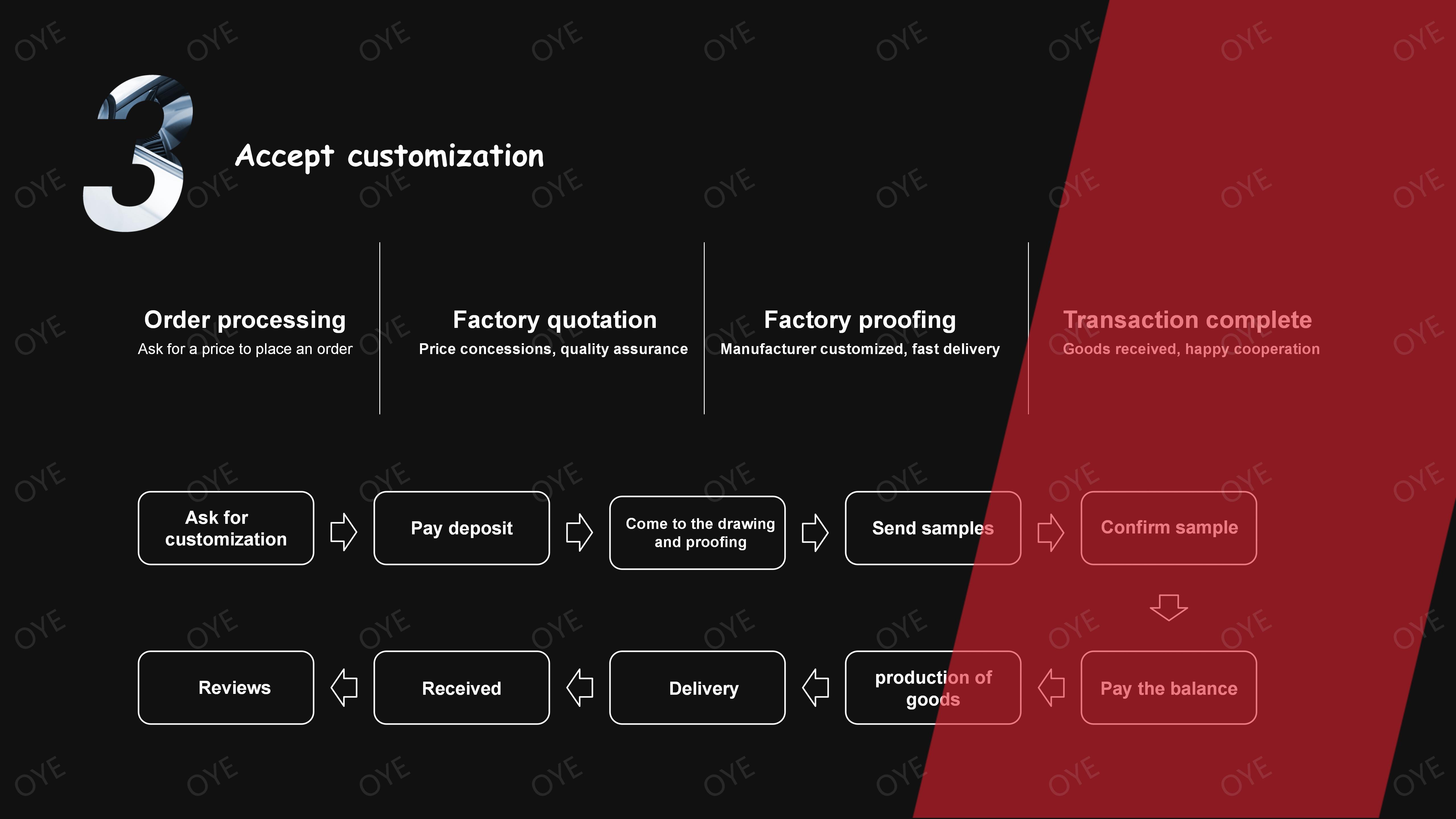 Require customization--pay a deposit--draw a sample--send a sample --confirm the sample--pay the balance--produce the goods--ship the goods--receive--comments |