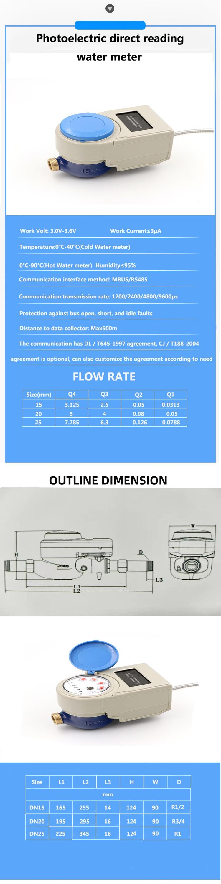 The photoelectric direct reading remote water meter is specially designed for daily water use. M-BUS/RS485 communication is adopted to realize remote collection of water consumption, effectively avoiding meter reading by management departments. The product has a valve control function, so that the management department can control the water consumption conveniently. itNo power is required, except forWhen meter reading or valve control is required.Low cost, reliable and efficient.