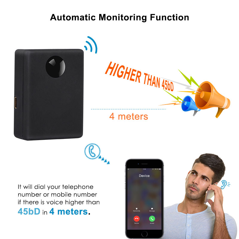2. Sound alarm function: When the surrounding sound rises to 45DB, the device will automatically call back to the preset phone number;