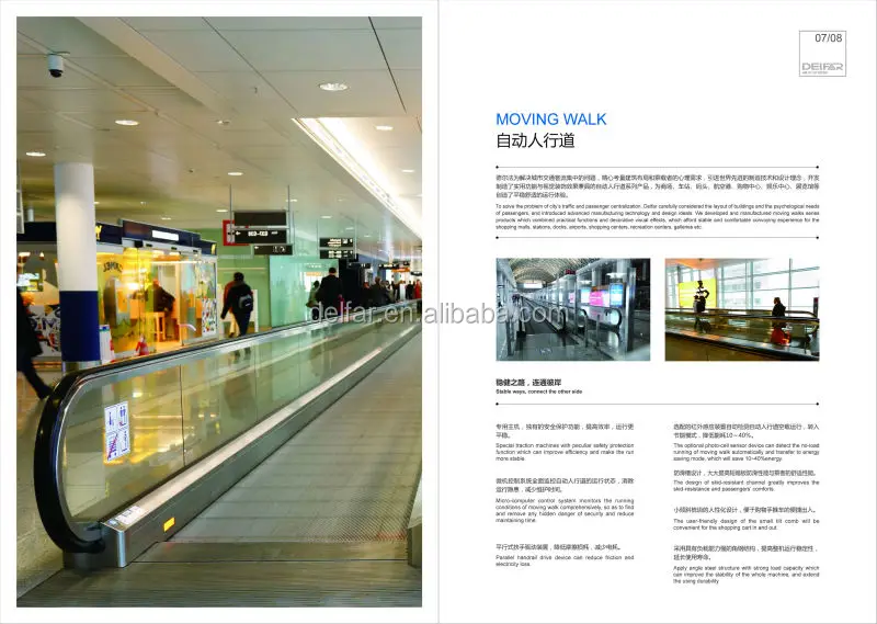For moving walk, we can supply different angle automatic sidewalks from 0° to 12°, it can solve the transportation of a huge flow of people, but also a beautiful flowing landscape in the building,now it's very popular in major shopping malls, railway stations, docks, airports, shopping centers, entertainment centers, exhibition halls and other public places.