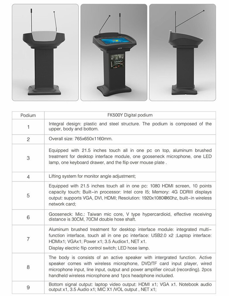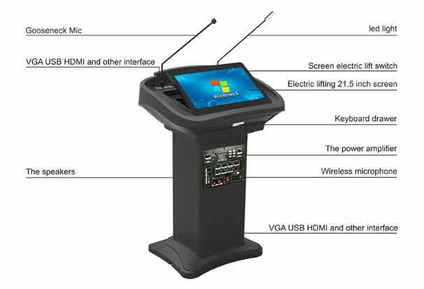 FK500Y podium with built-in loudspeaker, LED light, automatic lift, touch all-in-one computer/writable screen 21.5", steel + ABS plastic configuration with ultra-thin beauty