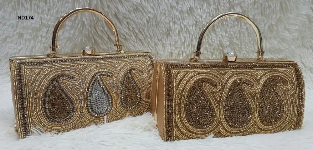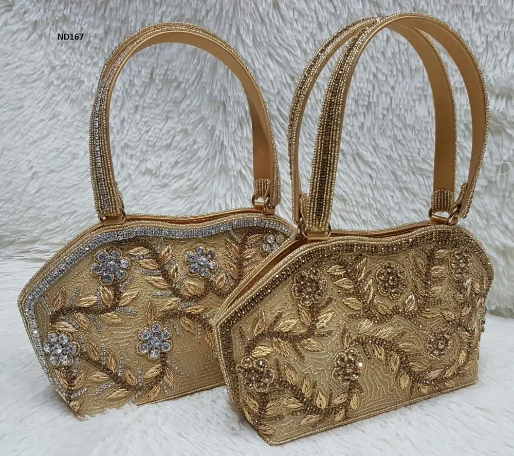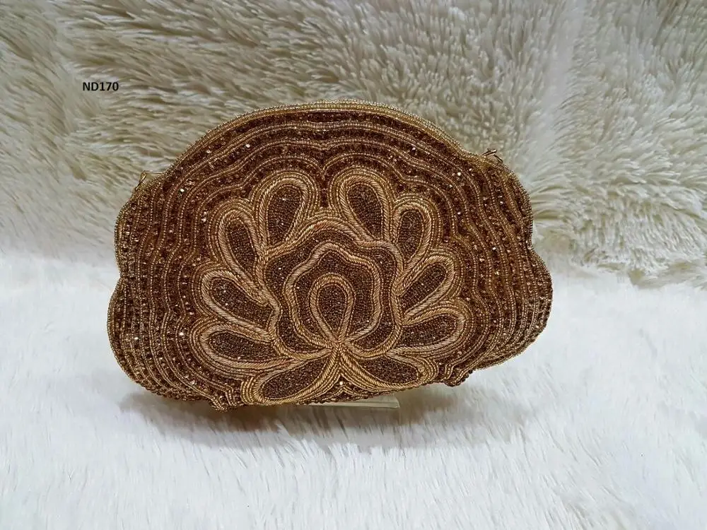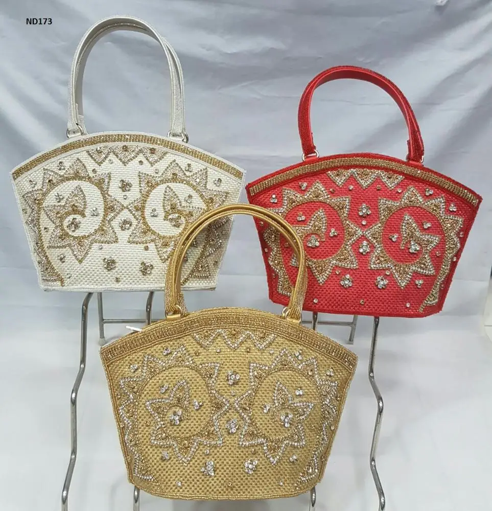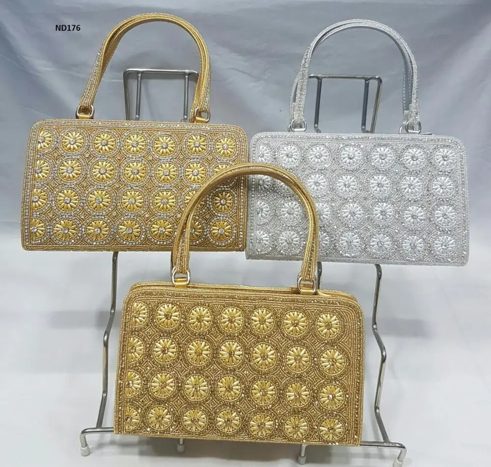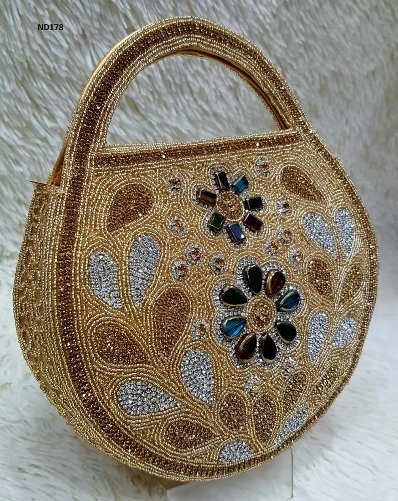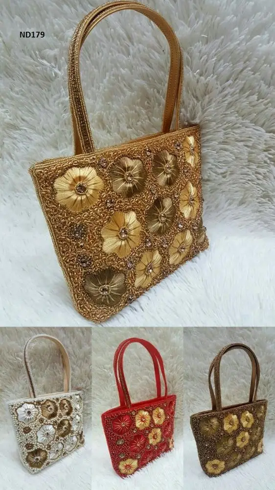 Exclusive assortment and massive collection of various types of Indian women's handbags including handmade, embroidered, metallic, coloured gemstone beaded. The metal bag is made of copper and plated in antique gold, bright gold, silver or black. Designer bags are made in various types of fabrics, including jute, satin, brocade, and are hand-embroidered, including zardosi work and more.