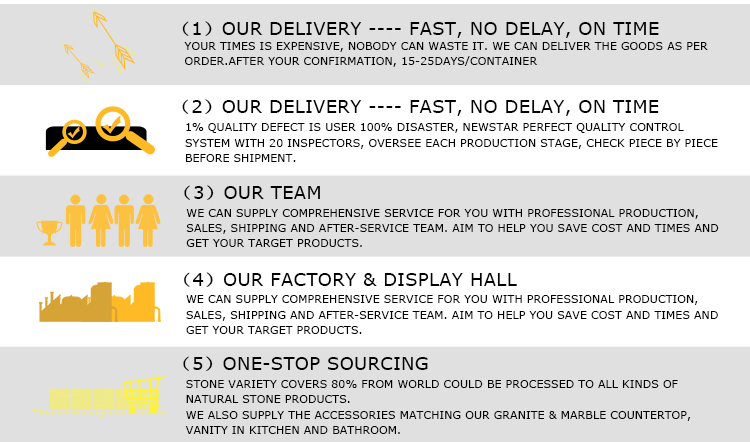 Newstar is a professional stone supplier from China, with more than 12,000 kinds of stone from 233 countries around the world. We have been engaged in stone supply for more than 21 years, and won Alibaba's 2012 Global E-commerce Top 10. In addition, it has won a good reputation in granite and marble, and also has good processing performance in countertops. We abide by our tenet: "Thoughtful pre-sales instructions, huge product system, professional quality inspection, fast delivery." If you are looking for stone products, Newstar is your best choice.