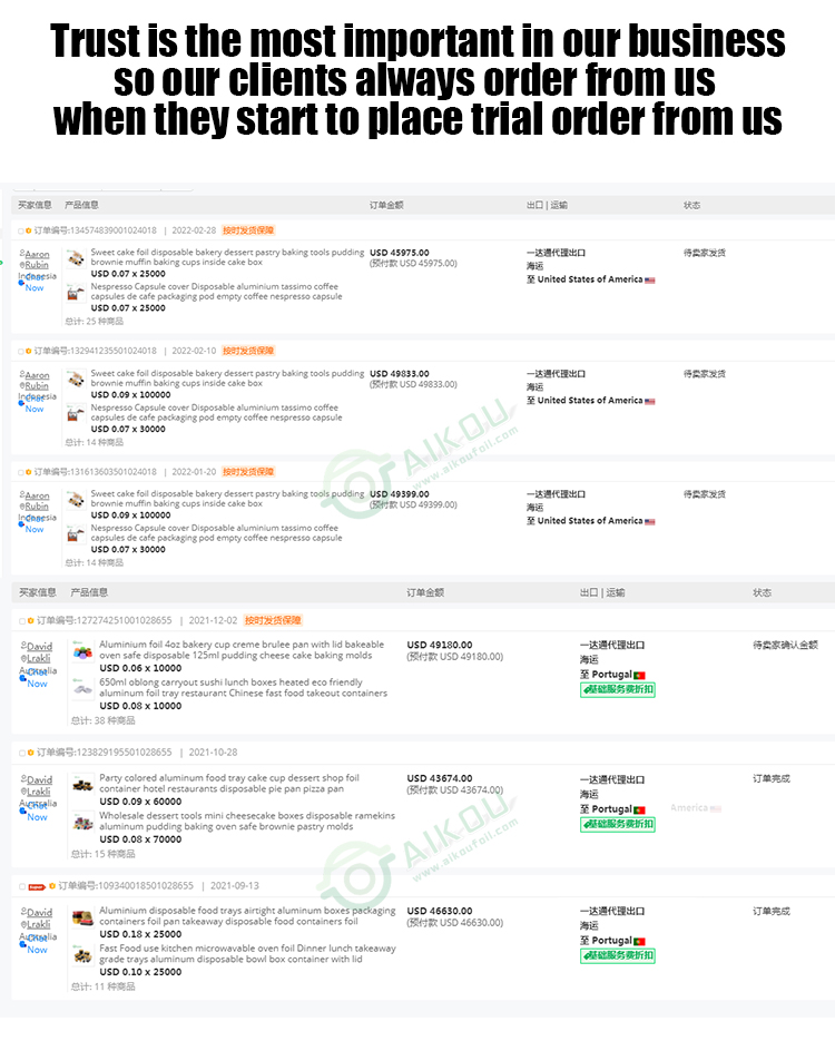 smooth wall foil container 300ml-500ml: 100pcs/bag; 10bags/carton; 1000pcs/carton 500ml-1000ml: 125 pieces/bag; 4 bags/box; 500 pieces/box 1000ml-3000ml: 100 pieces/bag; 2 bags/box; 200 pieces/box
