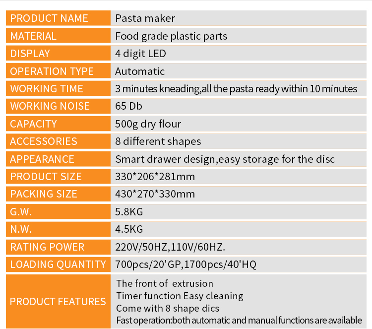 | operating hours | Knead the dough for 3 minutes and all the pasta will be ready within 10 minutes |