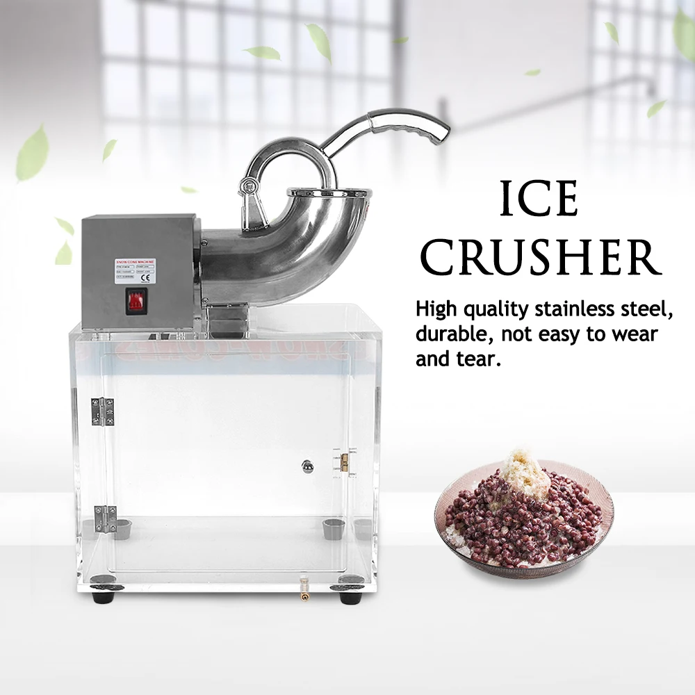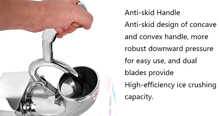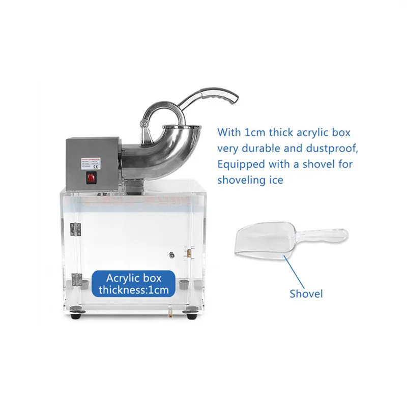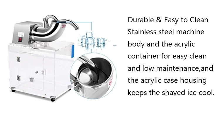 The world originate full stainless&acrylic snow cone machine,it’s main used for crushing big ice into small ice ,it’s usually applied to cold drinks series, it’s also applied to slicing up popular foods(fruits and vegetables).This product make from full stainless steel ice crusher and acrylic box, ,it has many advantages ,just like non-rusty ,safety, pro environment, health and so on. It adopts vacuous double layer stainless technique, so the cold energy wouldn’t waste. Use the acrylic box to keep the ice,health and hygiene.